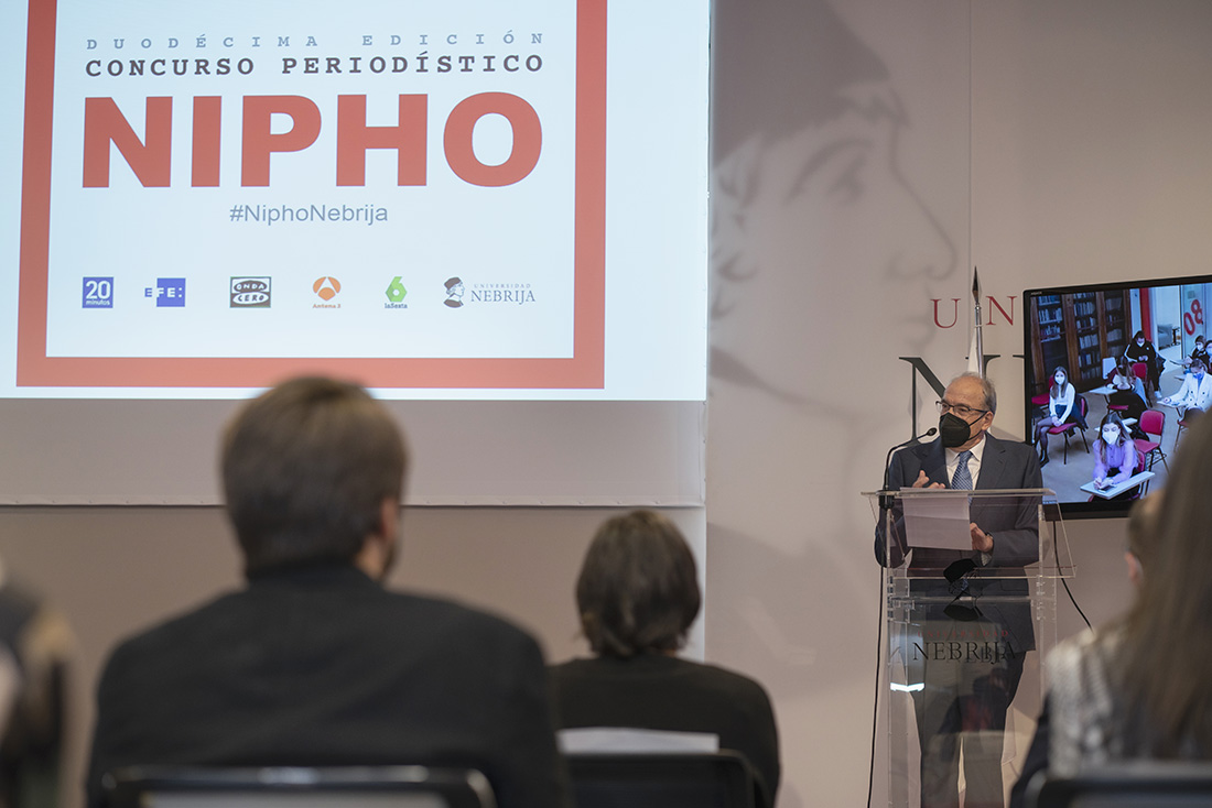 Los galardones NIPHO son uno de los actos más emblemáticos de la Semana de la Facultad de Comunicación y Artes de la Universidad Nebrija. Su decana, Marta Perlado, agradeció el trabajo de Marta Saavedra, recién nombrada vicedecana de la Facultad, y elogió tanto a los premiados -“por contar la verdad por encima de todo y de todos”- como el método learning by doing (aprender haciendo) de la Universidad Nebrija. Un sistema de enseñanza al que también se refirió el rector José Muñiz como uno de los valores generales y de empleabilidad de Nebrija. La pasión por el saber, la colaboración simbiótica entre universidad y empresa, la enseñanza híbrida y las acciones “innovadoras, creativas y disruptivas” fueron otras de las claves de la Universidad Nebrija abordadas por el rector.