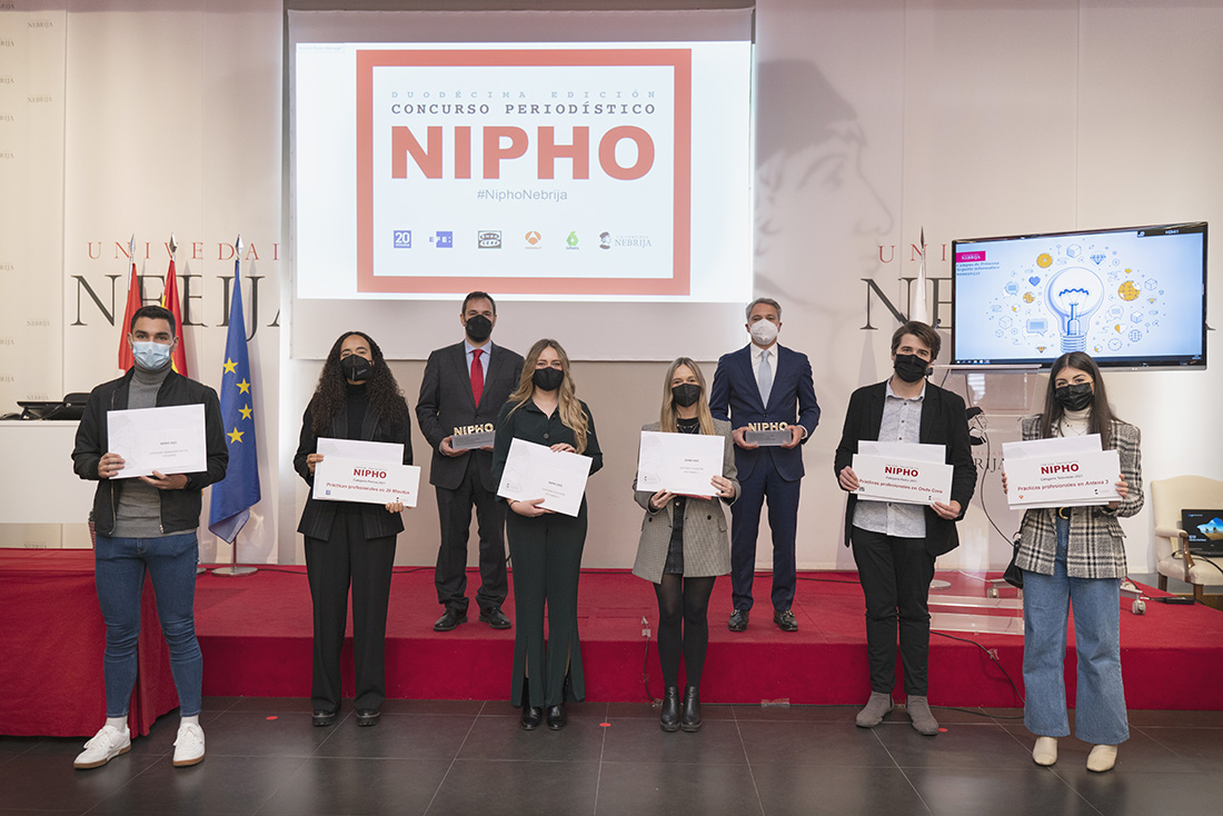 Por otra parte, los ganadores de la duodécima edición de NIPHO en las diferentes categorías de Grado y Máster fueron Soraya Aybar (1º Periodismo, premiada con prácticas en 20 minutos) –modalidad de “Prensa escrita-, Diego Fernández (3º Periodismo, premiado con prácticas Agencia EFE) –“Fotografía”-, Laura Payá y Victoria Soldevilla (4º Audiovisual, premiadas con prácticas en Antena 3) –“Televisión grado”-, Raquel Berenguer y María Muñoz (Máster en Periodismo en TV, premiadas con dos tablet)- “Televisión máster”-, Ernesto García Ojeda (2º Periodismo, premiado con prácticas en Onda Cero) – “Radio grado”-, Noelia Gómez (Máster en Radio, premiada con un set de podcasting) –“Radio máster”- y Guillermo Gallegos (Máster en Periodismo Digital, premiado con una tablet)-“Prensa digital”.