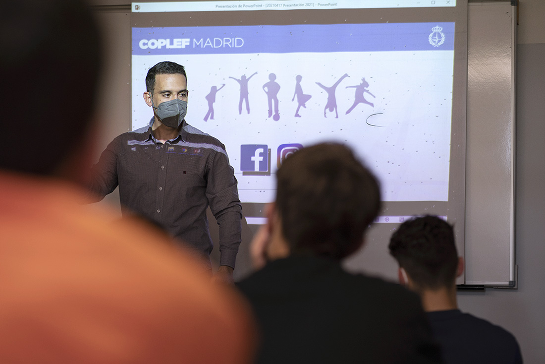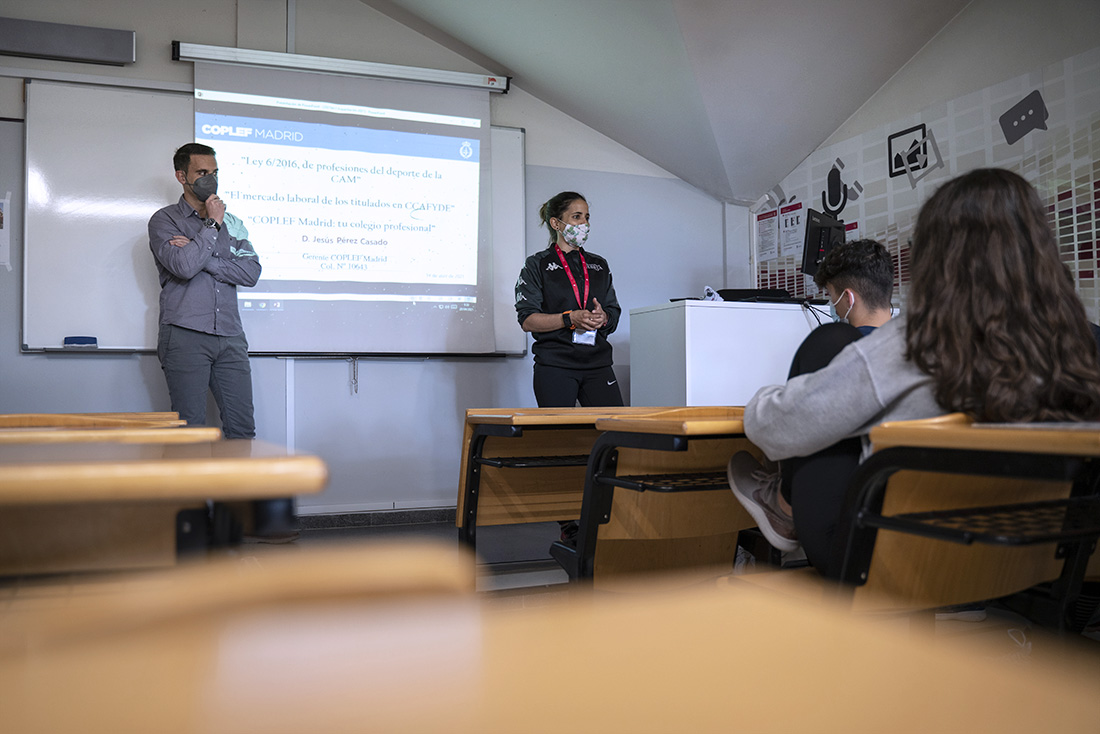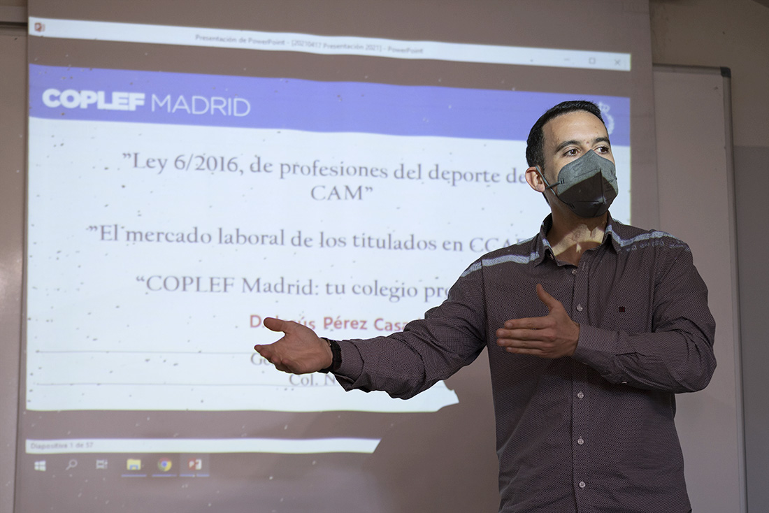 Jesús Pérez explicó a los alumnos que “el Grado de CCAFD no es suficiente para trabajar en la Comunidad de Madrid”. Antes de ejercer es necesario “hacer una comunicación previa a la Comunidad de Madrid para ser habilitados. También es necesario tener un seguro de responsabilidad civil”.