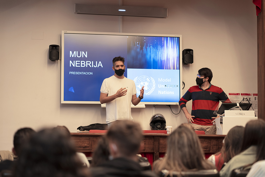 El miércoles 13 de octubre tuvo lugar la presentación de NebrijaMUN a los alumnos de 1º y de 2º curso de Relaciones Internacionales. Los coordinadores, alumnos veteranos del Grado, junto con ex alumnos, -antiguos miembros de NebrijaMUN-, con la tutora de 1º, Gracia Abad, y con la directora del Departamento y del grado en Relaciones Internacionales, Adela Alija, se reunieron con los alumnos que desean incorporarse a esta actividad.