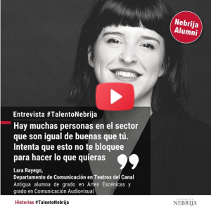 Lara Rayego es antigua alumna del Grado en Artes Escénicas y Grado en Comunicación Audiovisual. Se considera una persona muy alegre y trabajadora y confiesa que sigue teniendo los mismos sueños que cuando entró en la universidad, solo que ahora los ve desde otra perspectiva. Acaba de fichar por el departamento de Comunicación de los Teatros del Canal, tras haber trabajado en la comunicación de otros festivales de teatro a nivel nacional y eventos culturales desde que empezó, hace unos años, de la mano de Pentación Espectáculos.