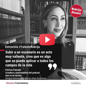 Patricia Palombi es antigua alumna del Grado en Artes Escénicas. “Estás donde tienes que estar” es su mantra actualmente, y no pierde de vista su gran meta: No dejar de crear y vivir del arte. Confiesa que sigue teniendo la misma ilusión que cuando entró en la universidad y que su sueño de hacer su película sigue intacto.
