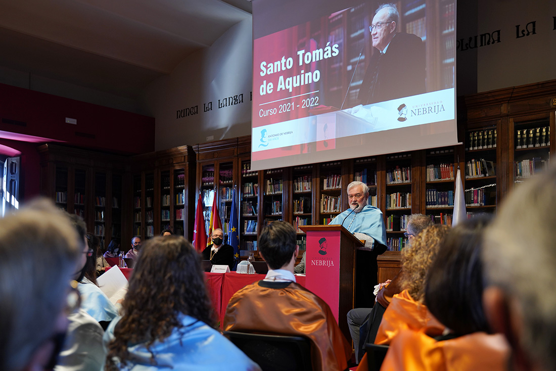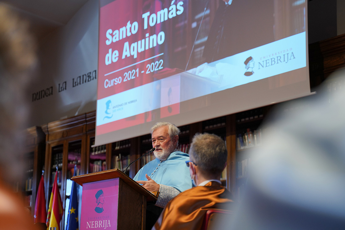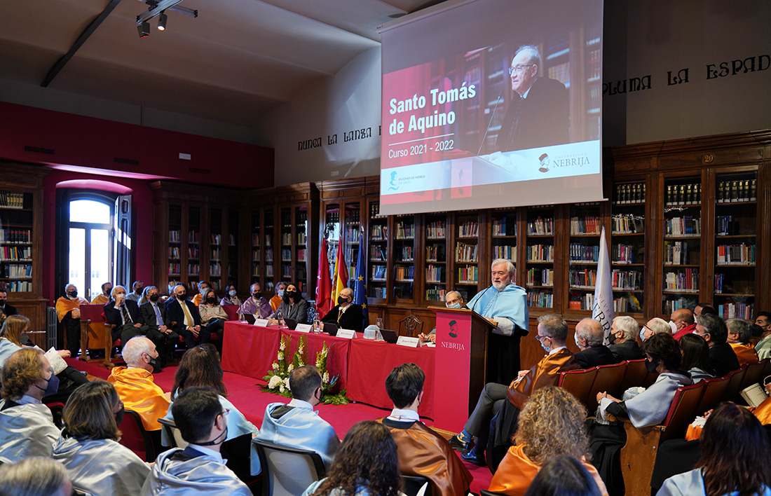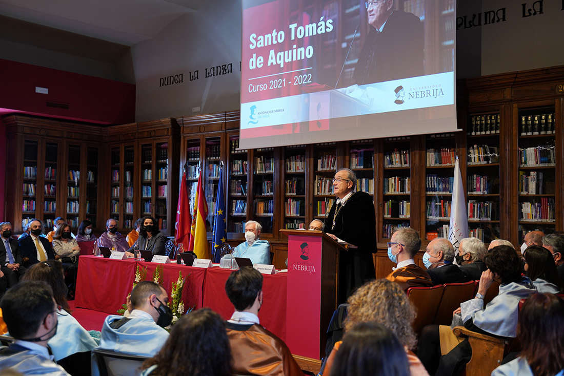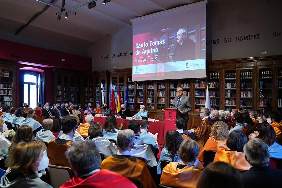 Darío Villanueva, presidente del Patronato de la Universidad Nebrija y exdirector de la Real Academia Española, pronunció la lección magistral La verdad de las distopías en el acto de la festividad de Santo Tomás de Aquino celebrado en la biblioteca del Campus de Madrid-Princesa. Antes, habían tomado protagonismo el cortejo ceremonial de la Universidad y los corrillos de personalidades en torno al V Centenario del Fallecimiento de Antonio de Nebrija.