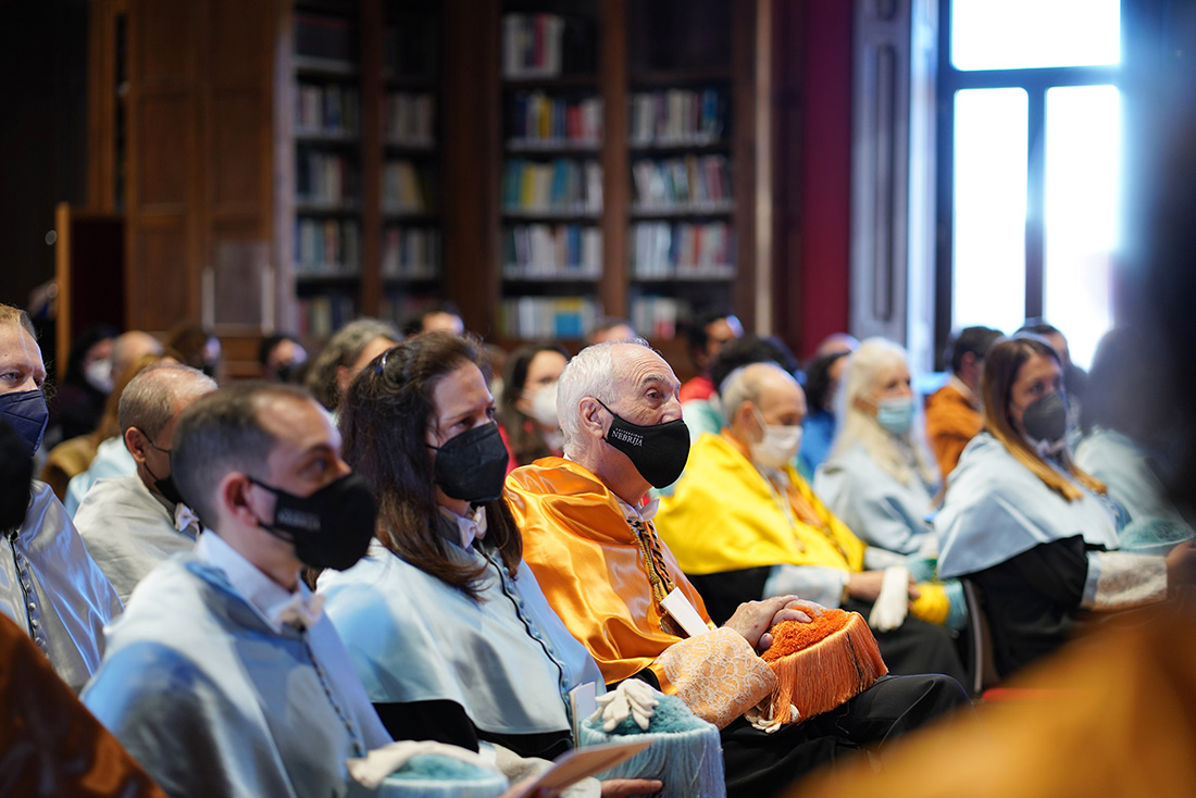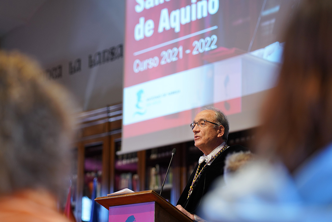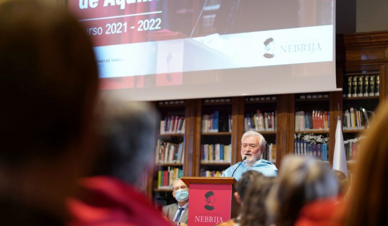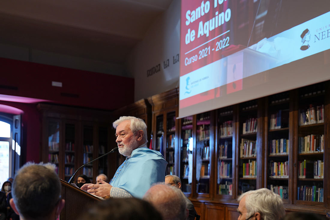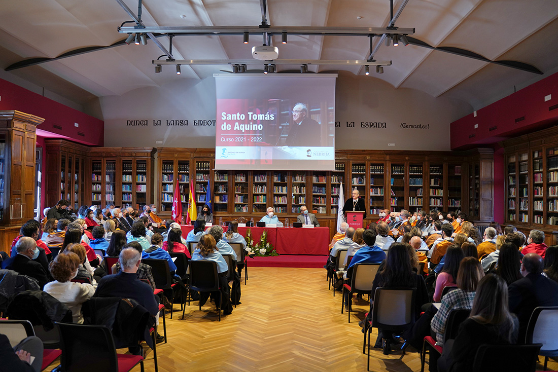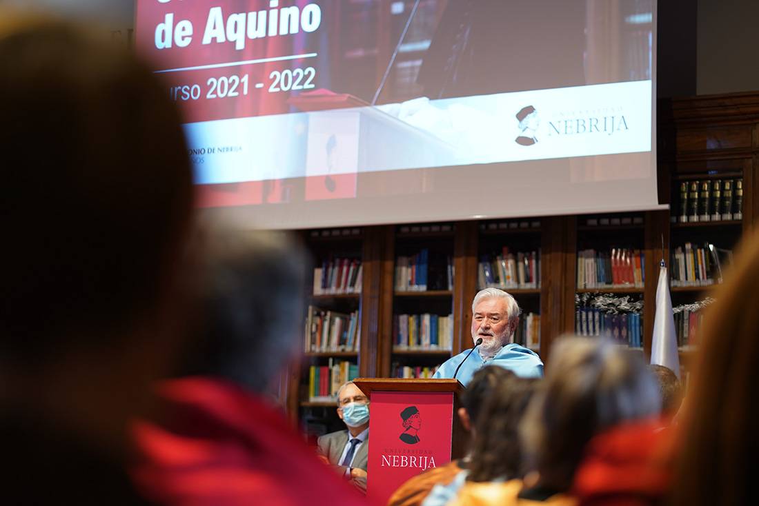 Darío Villanueva, presidente del Patronato de la Universidad Nebrija y exdirector de la Real Academia Española, pronunció la lección magistral La verdad de las distopías en el acto de la festividad de Santo Tomás de Aquino celebrado en la biblioteca del Campus de Madrid-Princesa. Antes, habían tomado protagonismo el cortejo ceremonial de la Universidad y los corrillos de personalidades en torno al V Centenario del Fallecimiento de Antonio de Nebrija.