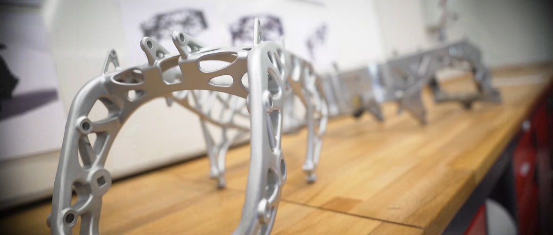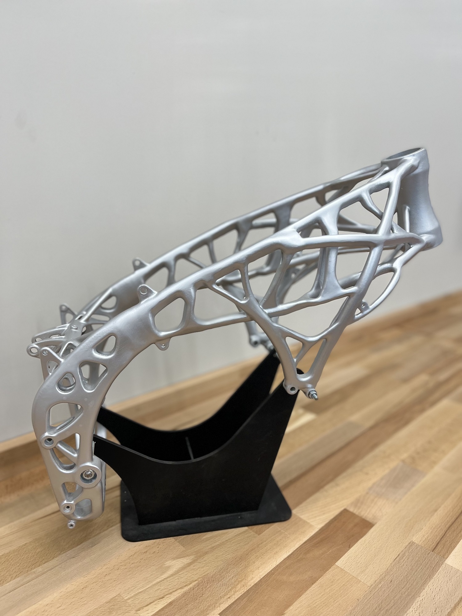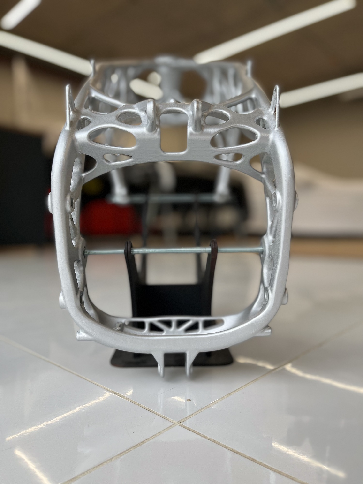 El hecho de conseguir piezas huecas es la piedra angular de esta colaboración, ya que es la manera de conseguir soluciones muy ligeras en acero, logrando espesores muy reducidos en el proceso de impresión 3D; algo que hoy en día es difícil de obtener con el aluminio y el titanio, y que por tanto podría tener una penalización en su capacidad estructural. Confirmada la estabilidad del acero con esos espesores y aseguradas las propiedades mecánicas, se integraron estas condiciones de contorno en los algoritmos de diseño inteligente para que, de manera automática, fuesen capaces de generar un abanico de formas geométricas innovadoras, que fuesen estables a la hora de imprimirse y cuyo diseño respetase en todo momento ciertas orientaciones que evitasen la generación de soportes internos. “Logrado y validado todo esto, estábamos en disposición de poder aplicarlo al chasis y prácticamente a cualquier pieza”, reseña Corbera.