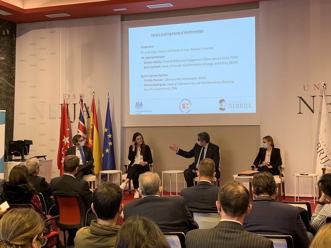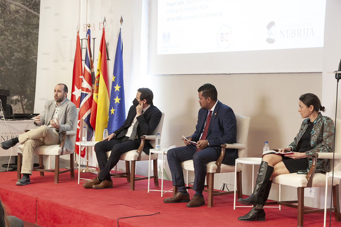 El uso de nuevas tecnologías para crear y contrarrestar la desinformación fue el segundo asunto de debate de la Conferencia sobre Ciberseguridad Reino Unido-España 2022. Moderada por Luis García Segura, director del Máster en Protección de Datos y Seguridad de la Universidad Nebrija, el debate contó con Clare Melford, cofundadora y directora ejecutiva de Global Disinformation Index; Miguel Molina, profesor de la Universidad de Granada y uno de los impulsores del Iberifier –Iberian Digital Media Research and Fact-Checking Hub– uno de los ocho centros que forman parte del European Digital Media Observatory de la Unión Europea, y Miguel Valle, jefe de unidad en la Subdirección General de Inteligencia Artificial y Tecnologías Habilitadoras (SEDIA).