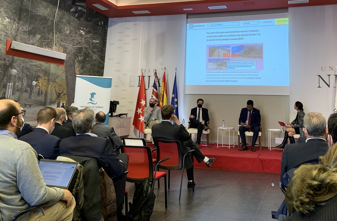 La primera mesa redonda de la jornada sobre ciberseguridad trató sobre las tendencias en la evolución de la desinformación y estuvo moderada por Jordi Regi, coordinador del Máster en Ciberdelincuencia y director del Máster en Acceso a la Abogacía (modalidad a distancia) de la Universidad Nebrija. Simeon Welby, jefe de Política del equipo de código abierto en el Ministerio de Asuntos Exteriores de Reino Unido, recordó que los mensajes falsos de Rusia sobre Ucrania “aprovechan una interpretación construida desde hace tiempo”. A su juicio, hay que tener en cuenta en esta lucha la aparición de técnicas de publicidad, las acciones de una “una gama de sitios web que parecen vinculados al gobierno ruso”, las narrativas de los influentes alineados con Putin y el uso de documentos elaborados que no provienen de fuentes creíbles. “La desinformación tiene muchas capas y el mensaje ruso en Ucrania lo demuestra. La desinformación es una vulnerabilidad y es esencial poder detectarla a tiempo real”, apostilló.