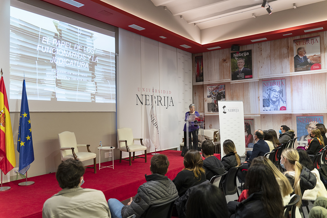 La independencia de los funcionarios y, en particular de los jueces, centró la ponencia de Encarnación Roca, vicepresidenta emérita del Tribunal Constitucional y exmagistrada del Tribunal Supremo, en un foro organizado para los estudiantes de Derecho de la Universidad Nebrija. Entre referencias a la Constitución, la también catedrática de Derecho Civil, que no tiene cuentas en las redes sociales, aseguró que “no debería haber ningún juez hablando en un medio de comunicación”, porque “un juez calladito está más guapo”.
