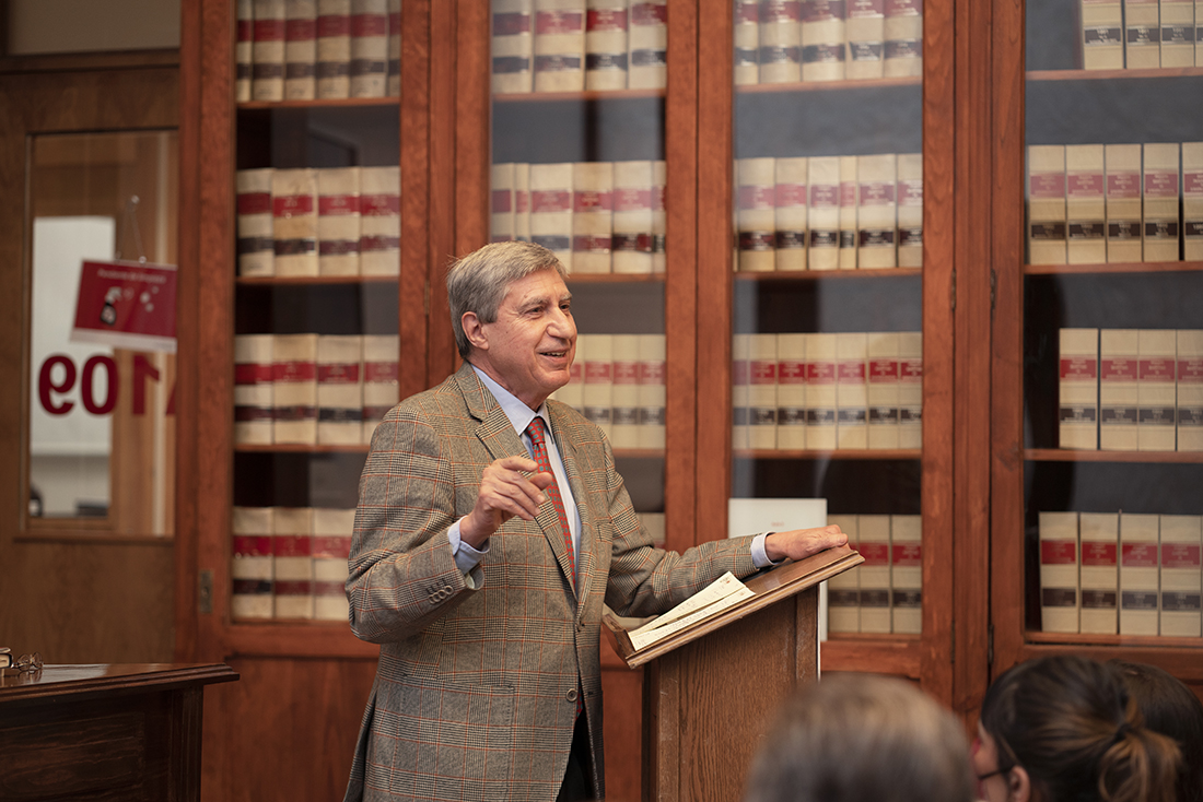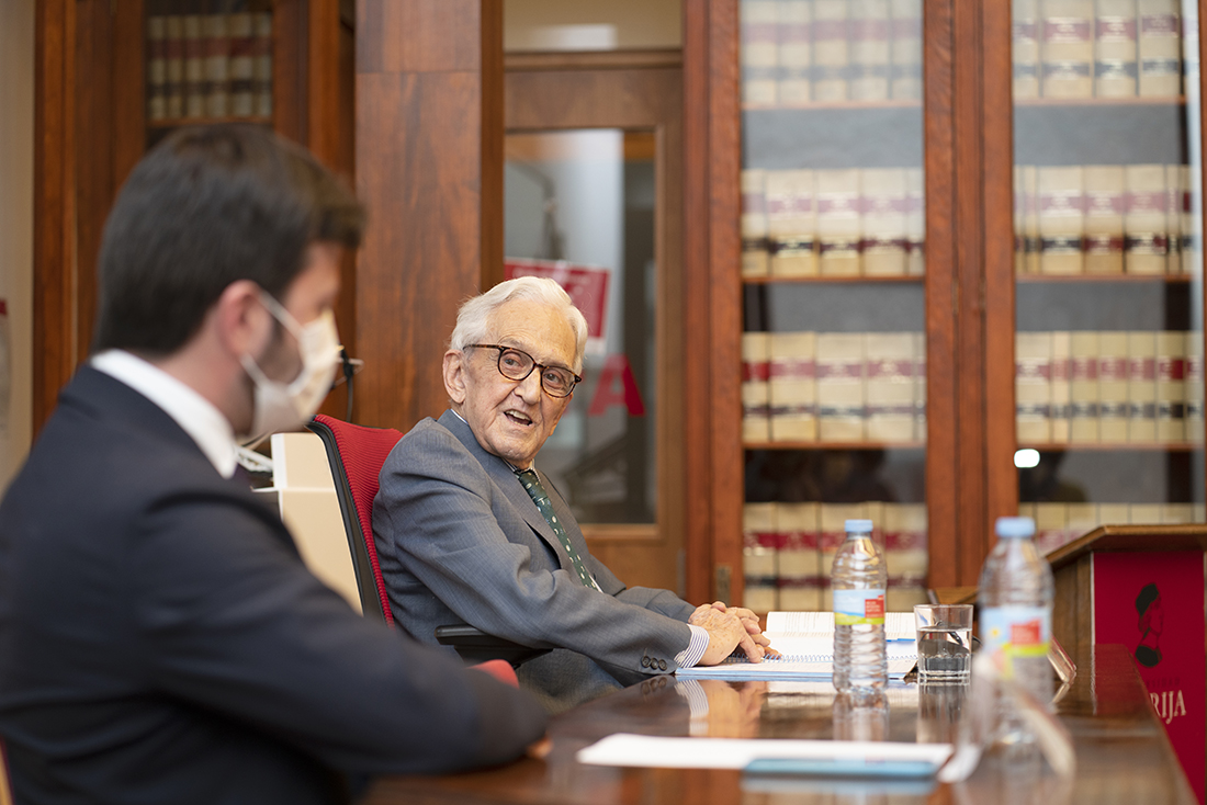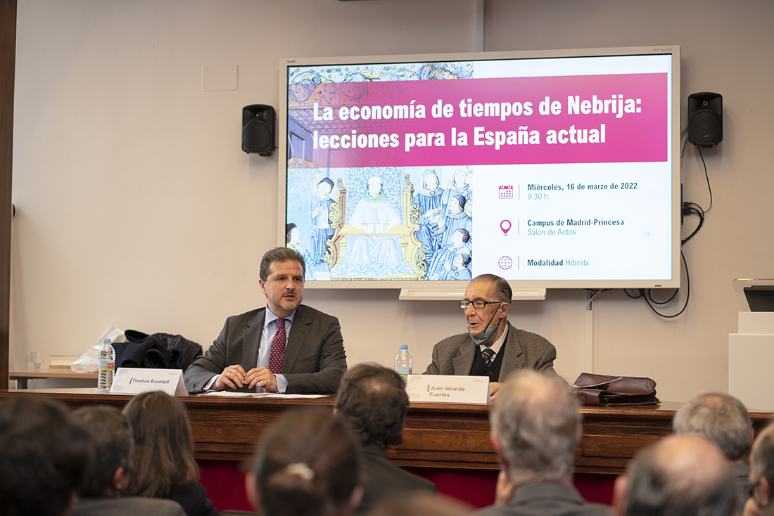 Velarde, presidente honorario de la Real Academia de Ciencias Morales y Políticas es uno de los grandes economistas que participaron en el seminario La economía en tiempos de Nebrija: Lecciones para la España actual. Organizado por el departamento de Economía y Empresa, la actividad se enmarca en el programa del V Centenario del Fallecimiento de Nebrija y contó con una numerosa asistencia de alumnos.