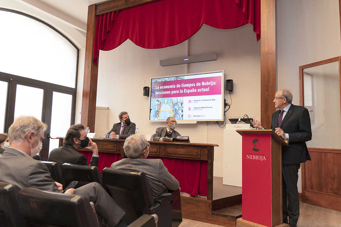 El rector de la Universidad Nebrija, José Muñiz, fue el encargado de clausurar el seminario planteado con la pregunta de las lecciones que quedan en la España actual de la economía de Nebrija. “Es difícil extrapolar al tiempo actual lo que aprendimos hace quinientos años”, admitió. “Lo que sabemos del pasado nunca nos vale para nada. No aprendemos. Lo estamos viendo en Ucrania, con un tipo que, según los psicólogos, responde al narcisismo, el maquiavelismo y la psicopatía”, en alusión a Putin.