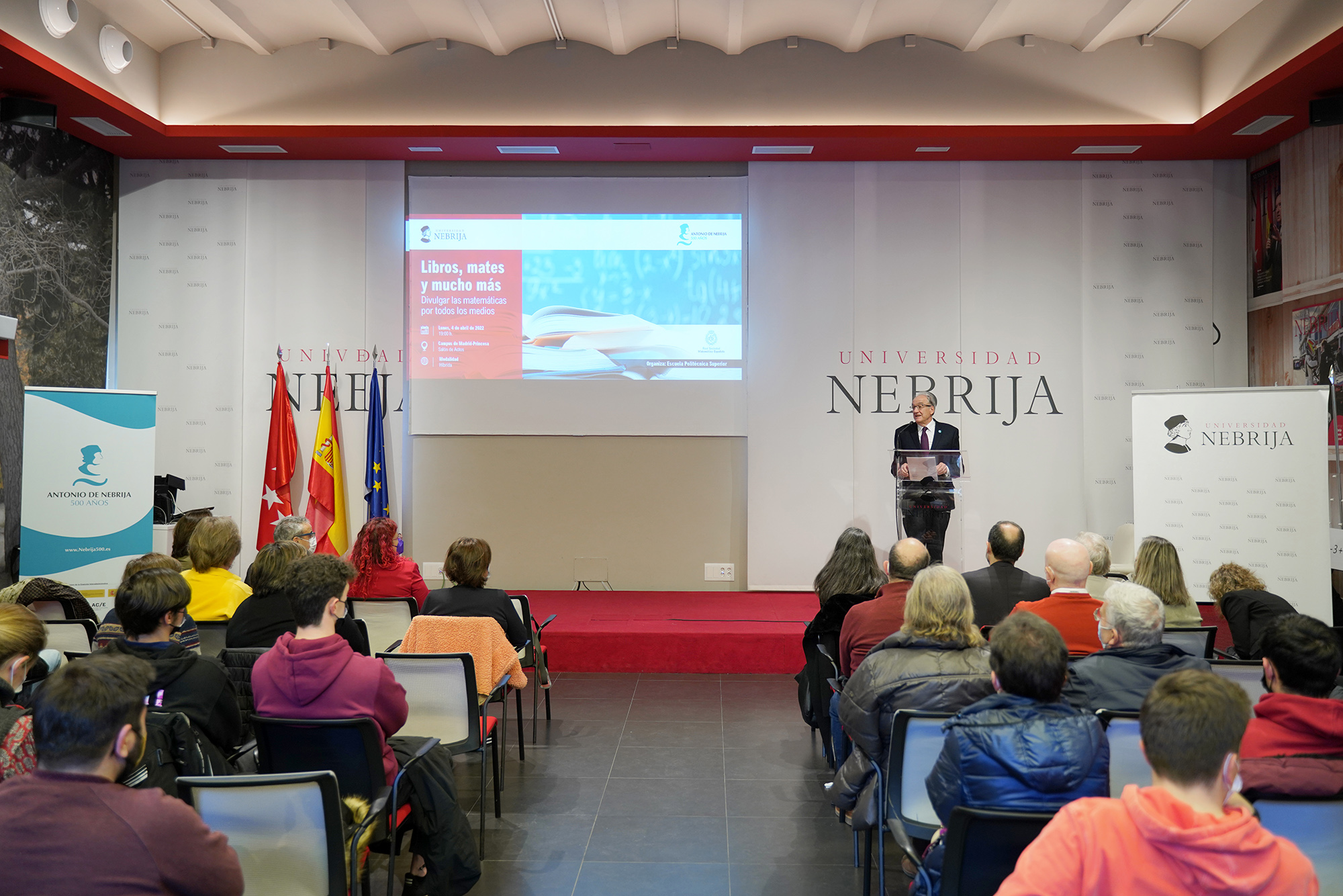 David Martín de Diego, ex vicepresidente de la RSME, Fernando Blasco, presidente de la Comisión de Divulgación de la RSME, y Pilar Vélez profesora de Matemáticas de la Universidad Nebrija y presidenta de la Comisión de Profesiones y Empleabilidad de la RSME, ejercieron de anfitriones y de nexos entre las conferencias. El programa comenzó con la bienvenida de Eva Gallardo, presidenta de la RSME, y José Muñiz, rector de la Universidad Nebrija. Ante la puesta en marcha para el curso que viene de los grados de Matemáticas, Físicas y el doble grado de ambas disciplinas, la Universidad Nebrija, según Muñiz, respira una “vocación matemática tanto en la docencia como en la investigación”, centrada en la Escuela Politécnica Superior, “que aspira a ser líder dentro de las universidades privadas españolas”.