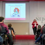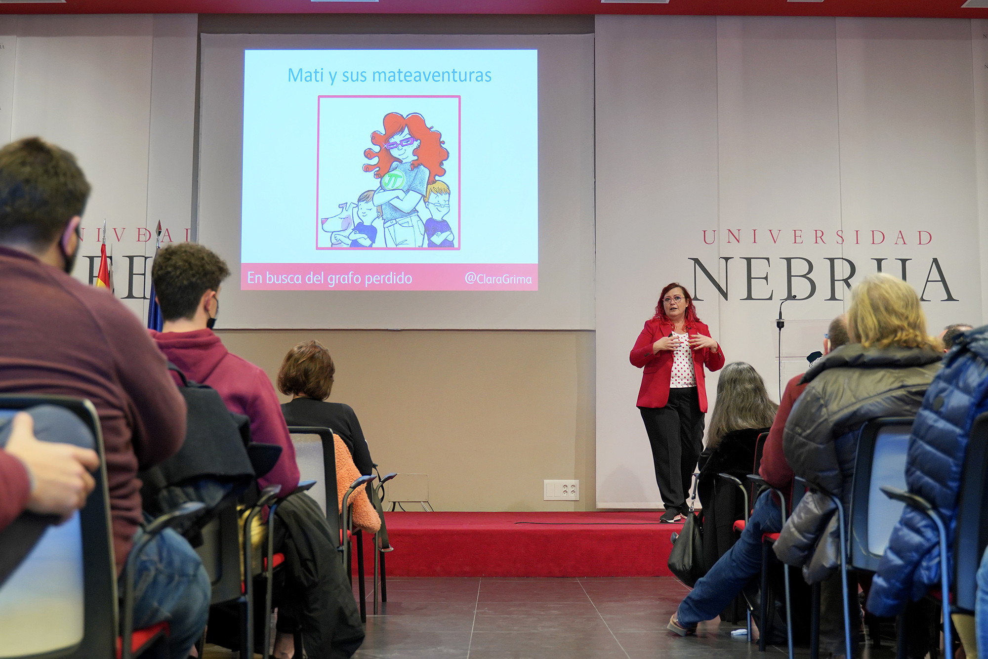 Clara Grima vino a la Universidad Nebrija a hablar de su libro En busca del grafo perdido, pero antes la profesora titular de Matemática Aplicada en la Universidad de Sevilla contó sus inicios como divulgadora. Todo surge cuando sus hijos, Salvador y Ventura, le empiezan a hacer preguntas comprometidas a su madre, profesora para más señas. Acaban los tres convertidos en personajes de blogs y contenidos varios dedicados a advenedizos y curiosos de las mates. Premio COSCE 2017 por su trayectoria y Premio ROMA en la categoría Mujer STEM en 2019, Grima imparte cientos de charlas al año y colabora en medios de comunicación para llegar a todo tipo de públicos.