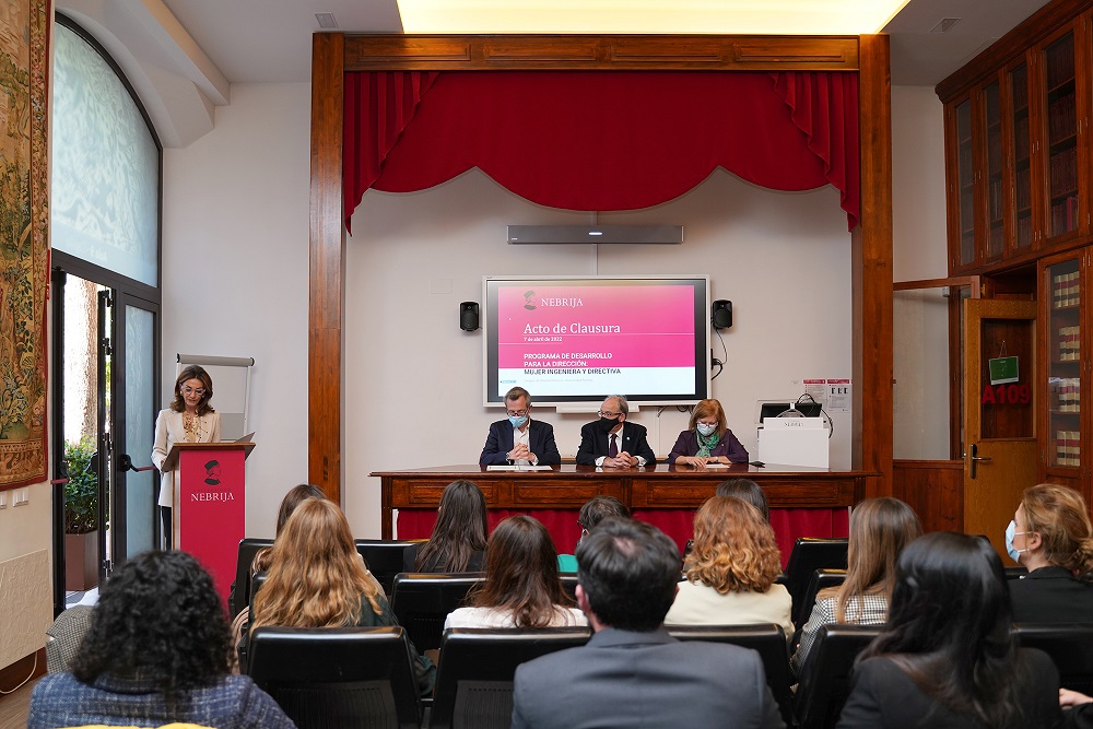 Al comienzo de la clausura, Ana Álvarez Castro, directora de Executive Education y Formación Continua de la Universidad Nebrija, mostró su confianza en que este curso “intensivo” haya potenciado el desarrollo profesional y personal de las matriculadas y haya ejercido de “trampolín” en sus aspiraciones directivas. Después de agradecer “el compromiso, la generosidad y la empatía” de María Luisa Poncela -madrina de la promoción-, Teresa Bustos, Mercedes Izarra (Talgo) y Tamara Codon (Navantia), Álvarez Castro recordó que la formación “es la mejor herramienta para la transformación, por eso –en alusión a las asistentes- la Nebrija Business School está aquí para apoyaros”.