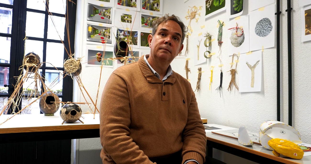 Respuesta: La estancia en Nebrija para mí es muy importante porque aterriza en un contexto madrileño, diferente al que he venido trabajando. Justamente la obra tiene que ver con esto, con uno seres que se trasladan en el tiempo y llegan a un Madrid diferente al que ellos esperaban. Son realmente viajeros en el tiempo, de millones de años, seres vegetales con cierto parentesco con las palmeras. Intercambiar experiencias con los estudiantes es un elemento relevante. El proyecto es sobre todo multimedia, parte de culturas casi neolíticas, llega al arte digital -modelación, proyección con vídeo mapping y audiovisual- y tiene un gran nivel de complejidad. Creo que muchas veces el artista en su formación desdeña posibilidades de sistemas de representación que pueden ir a su favor. En este caso, el lado ecológico o ecosófico, que el arte está tratando en la actualidad, quiero anclarlo en la tradición pictórica española, que, en la colección del Museo del Prado, plasma la cestería. Me interesa abordar cómo puede intervenir la cultura en su relación con la naturaleza y en qué dimensiones. Las piezas las trabajo en una escala ergonómica. La artesanía, y en concreto la cestería, como modelo no ha tenido un gran roce con la alta cultura. Para mí, la cestería es el modelo en el que nos deberíamos relacionar desde la cultura con la naturaleza.