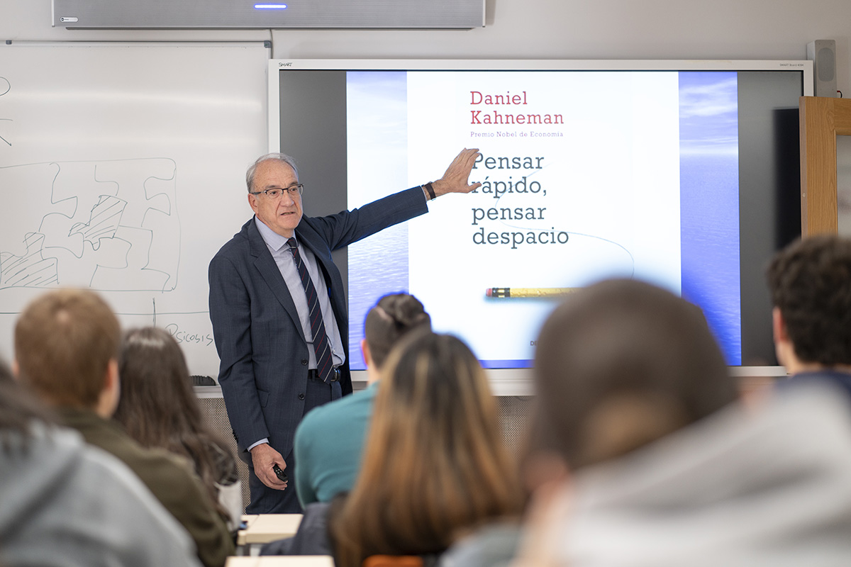 En los prolegómenos de su presentación, quiso dejar claro que la razón de ser de la psicología se resume en que el comportamiento humano no es lógico, sino psicológico. También hizo acopio de citas, como la del físico y matemático Lord Kevin, que en el siglo XIX ya preconizaba que “lo que no se mide, no se puede mejorar”, de lecturas como Pensar rápido, pensar despacio, del Premio Nobel de Economía Daniel Kahneman, y de los consejos para que los jóvenes lean más expresados recientemente en los actos de Nebrija por el filósofo Emilio Lledó y la periodista Mercedes Milá.