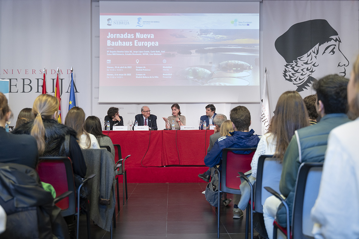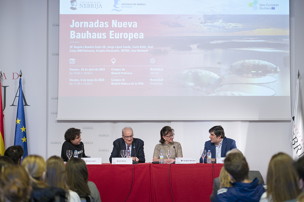 Para impulsar y divulgar los valores y las propuestas de la Nueva Bauhaus Europea, Fernando Moral, director de la Escuela de Arquitectura de la Universidad Nebrija, reunió, en el primero de los actos programados a Mª Ángeles Benítez Salas, directora de la Representación de la Comisión Europea en España; Jorge López Conde, Deployment Chief Manager para la New European Bauhaus (European Cluster Alliance); Carlo Ratti, director del Senseable City Lab (MIT), y Xavi Calvo, director general de València Capital Mundial del Diseño.