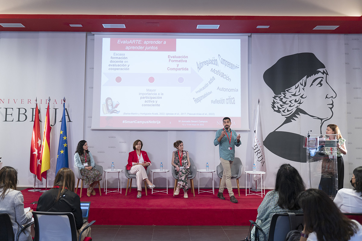 Patricia Ibáñez, gestora de Educación Digital de Global Campus Nebrija, moderó las primeras intervenciones de la mañana del viernes 13 de mayo. David Pizarro y Alba Práxedes, profesores del Grado en Ciencias de la Actividad Física y del Deporte, mostraron EvaluARTE: aprender a aprender juntos, una propuesta universitaria de evaluación formativa, compartida y de aprendizaje cooperativo. “Tradicionalmente se ha otorgado una muy escasa importancia a la evaluación y la cooperación, pero ahora eso está cambiando y el alumnado ya participa en este proceso con reconocidos beneficios”, afirmó David Pizarro. EvaluARTE contempla casos prácticos de tareas grupales donde los estudiantes tiene que cooperar para conseguir un objetivo común, realizar un reparto de roles y funciones y ser capaces de autoevaluarse. Después, se evalúa todo por parte de los docentes. La coevaluación, la autoevaluación y la heteroevaluación interactúan entre sí.