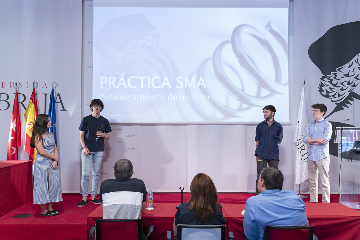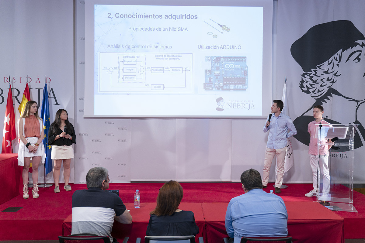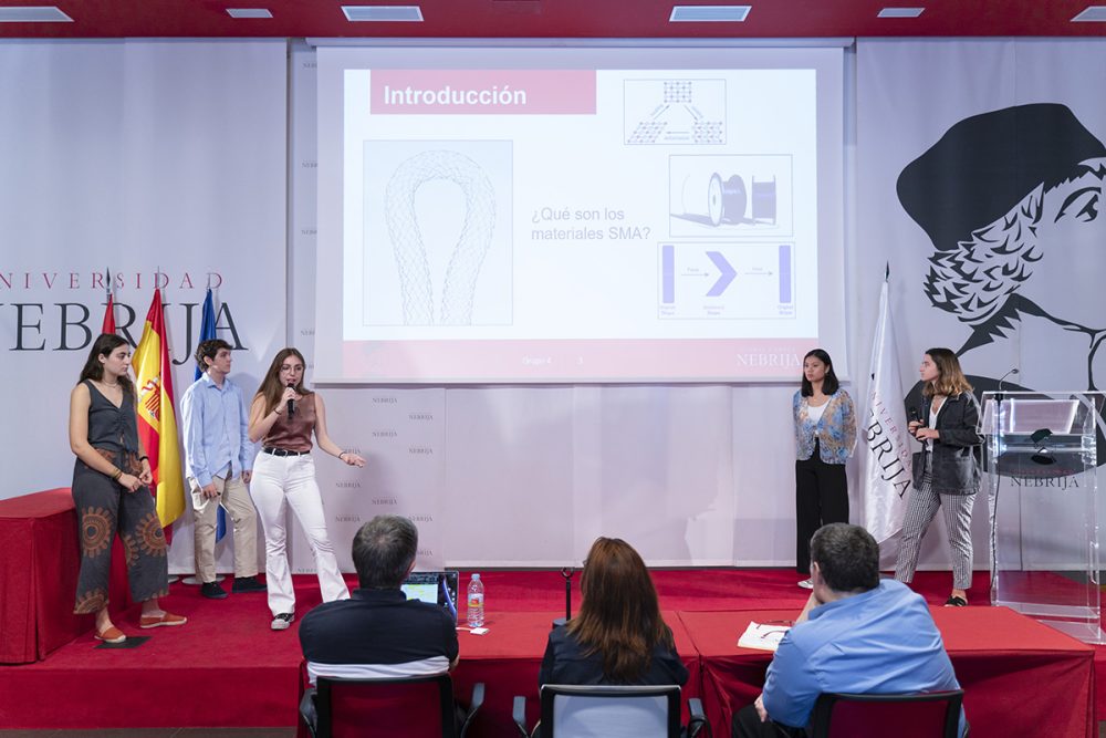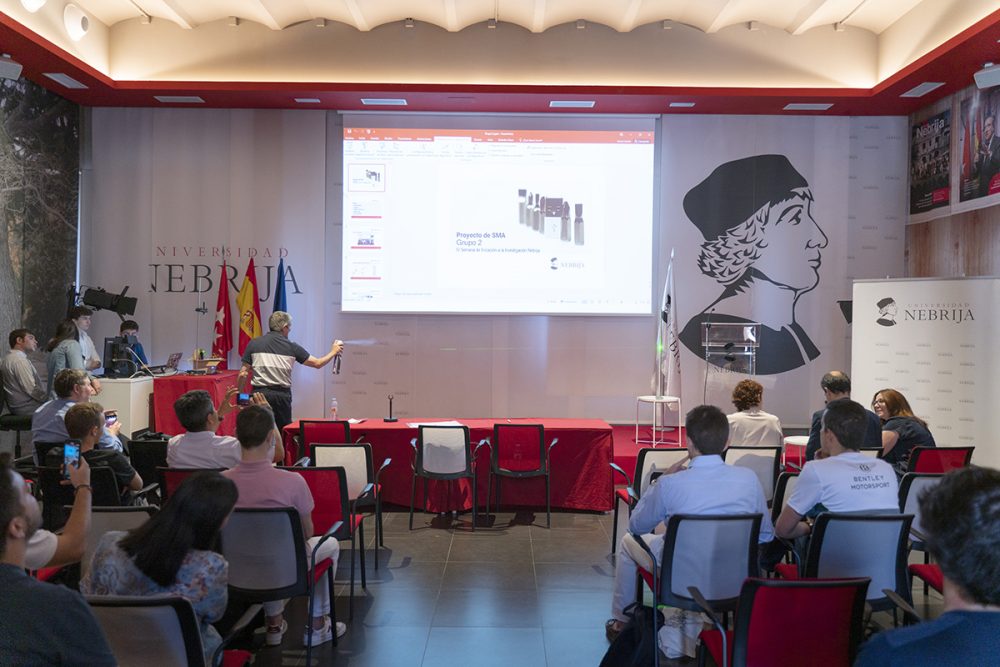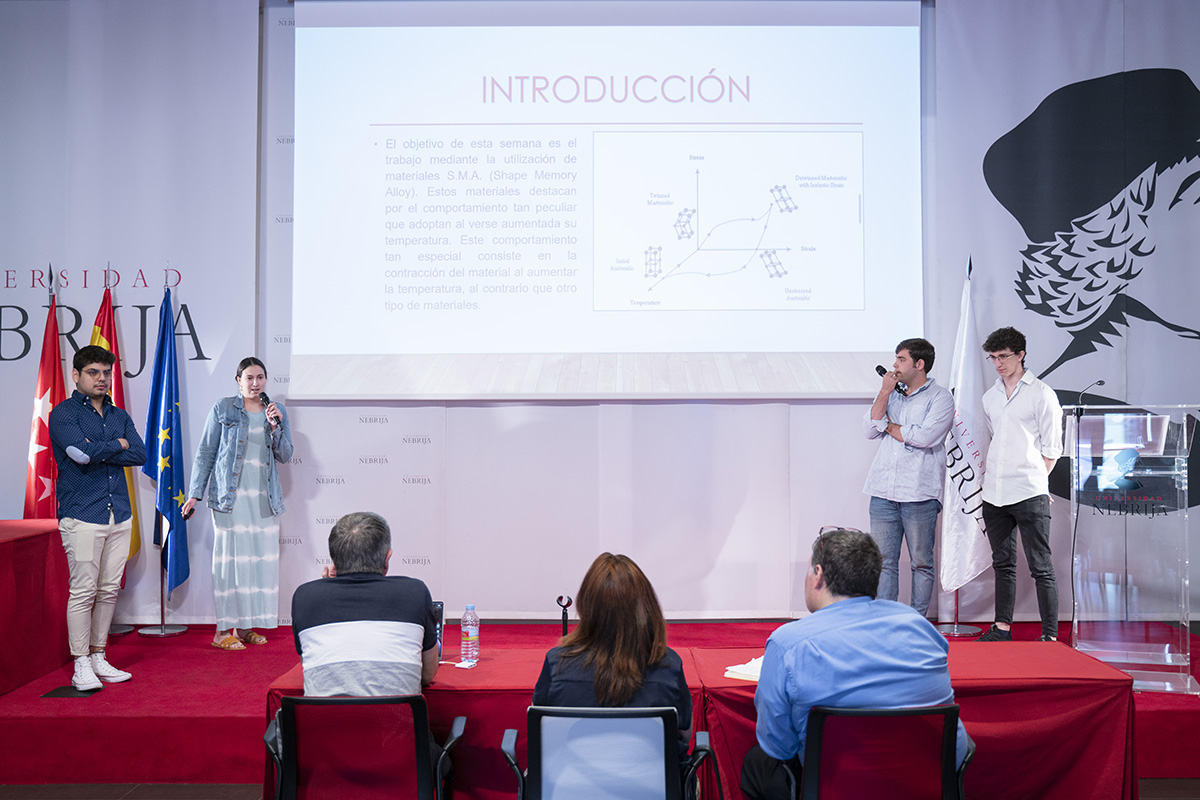 La IV Semana de Iniciación a la Investigación, organizada por la Cátedra Global Nebrija-Santander en Recuperación de Energía en el Transporte de Superficie, desembocó en la entrega de premios a los proyectos de los equipos multidisciplinares integrados por alumnos de distintos grados y cursos. En esta ocasión, los futuros ingenieros tuvieron que resolver un reto basado en los materiales con memoria de forma y, en el último día de la Semana, presentar su metodología y sus hipótesis a un jurado experto y a sus propios compañeros en el salón de actos y en los laboratorios.