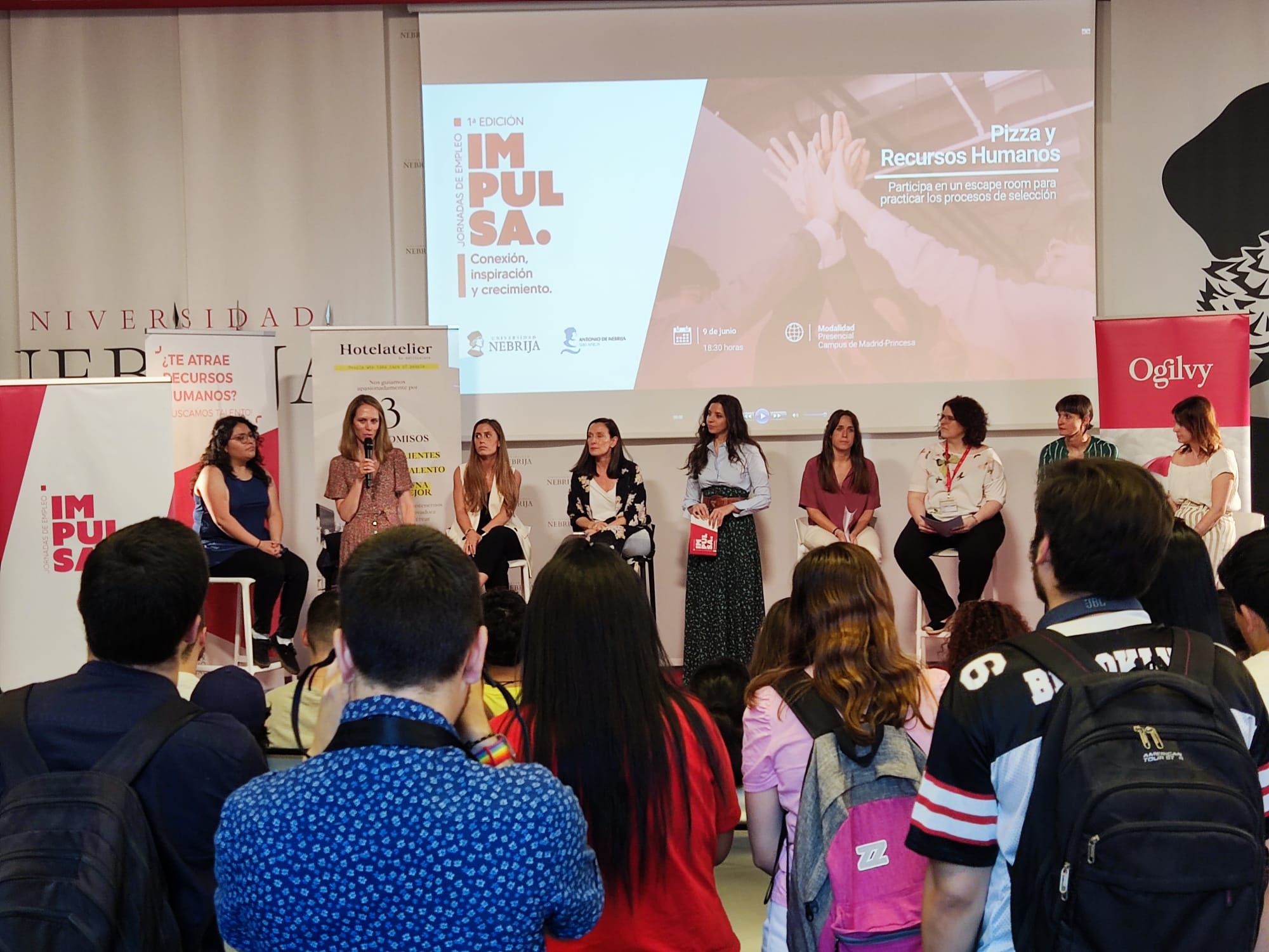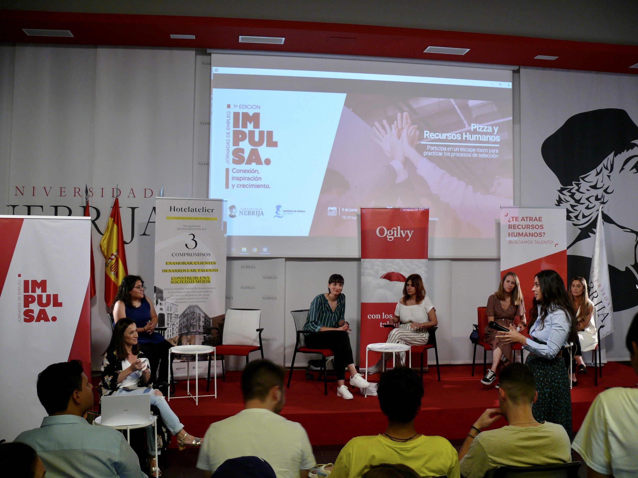 En ella, participaron expertas en selección de personal de empresas de sectores tan diversos como el turismo, la publicidad o el ámbito universitario, entre otros. Las integrantes del encuentro fueron: Karla León, antigua alumna de Nebrija y consultora internacional del Grupo BInternational, Carolina Arias, mánager de eventos, relaciones públicas y comunicación en Inhouse Smart Comunication, Maribel Benítez y Blanca Lázaro, reclutadoras de la agencia Ogilvy, Lucía García y Ana Muñoz, del equipo de selección de personal de Hotelatellier Petit Palace y Alba Maillo y Noemi Jiménez, integrantes del Departamento de Recursos Humanos de la Universidad Nebrija.