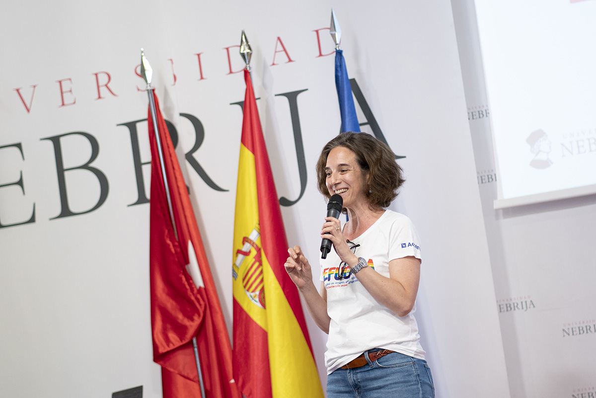 Tras la pausa, Sara Toro, asistente de investigación de la Cátedra y profesora del Máster en Didáctica del Español como Lengua Extranjera Nebrija-Difusión, organizó un taller donde “todos sacaron el arte que llevamos dentro”. La docente propuso enseñar al público a apropiarse de su diversidad para construir desde el humor y la autoparodia un objeto artístico tal y como ya hizo en su día el pintor Dalí. Tampoco faltaron referencias al popular Chico Fitness, con numerosos seguidores en TikTok.