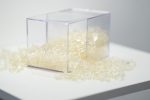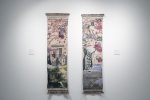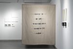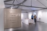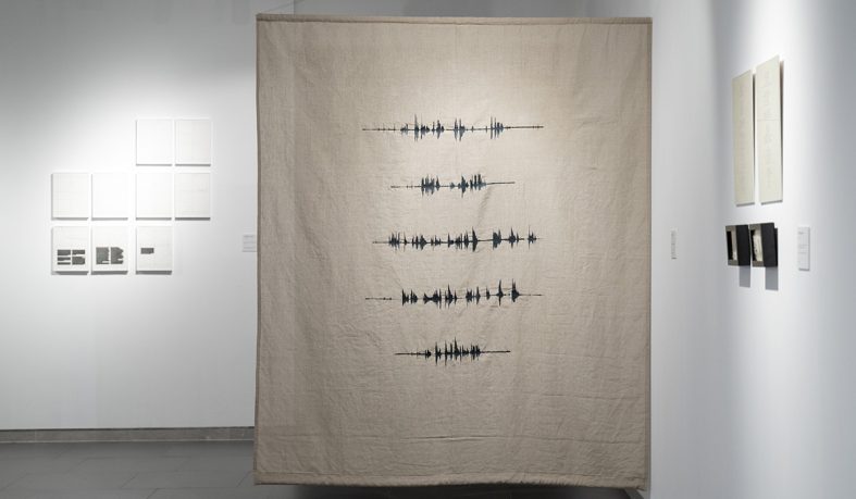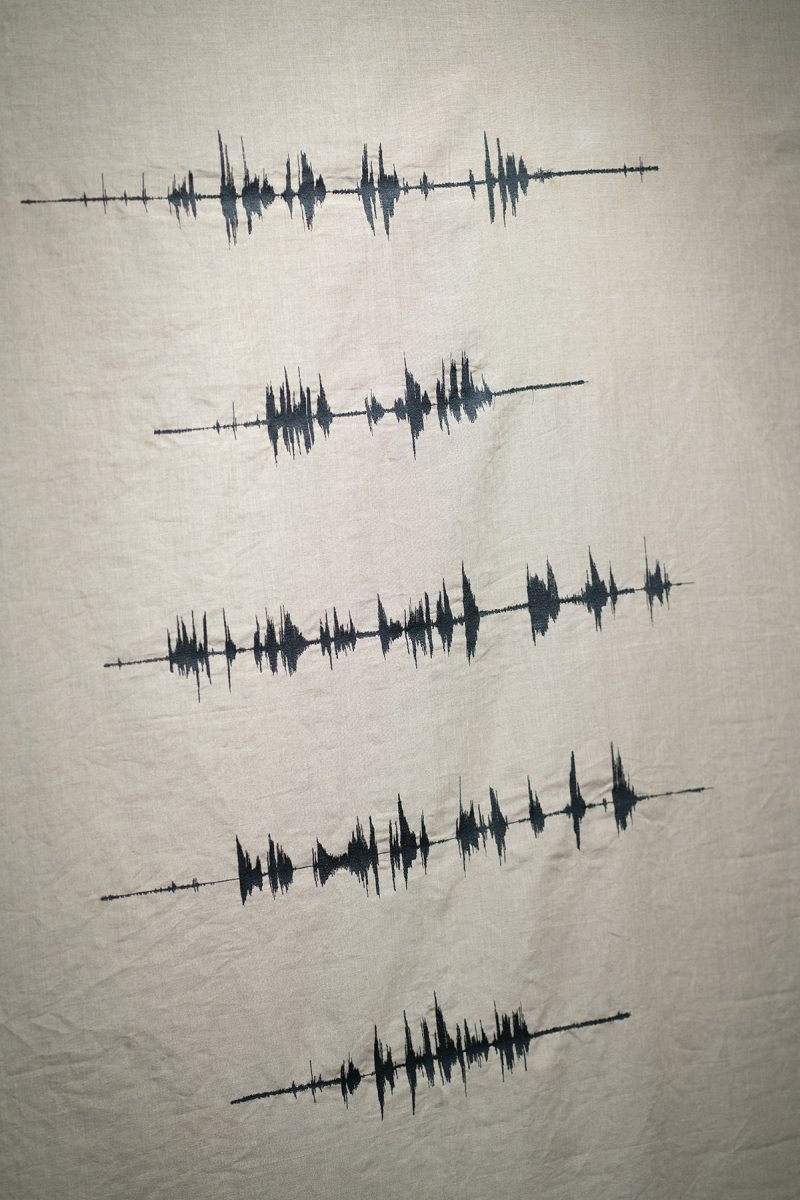 La obra premiada, Están aquí y allá: de paso, muestra una tela de lino donde aparece bordada la forma de onda sonora de la voz de Julia Llerena al leer un fragmento del poema Exilios, de Ida Vitale. “Son versos hechos hilos que nacen del interior para hacer la voz palpable y física”, asegura Llerena.