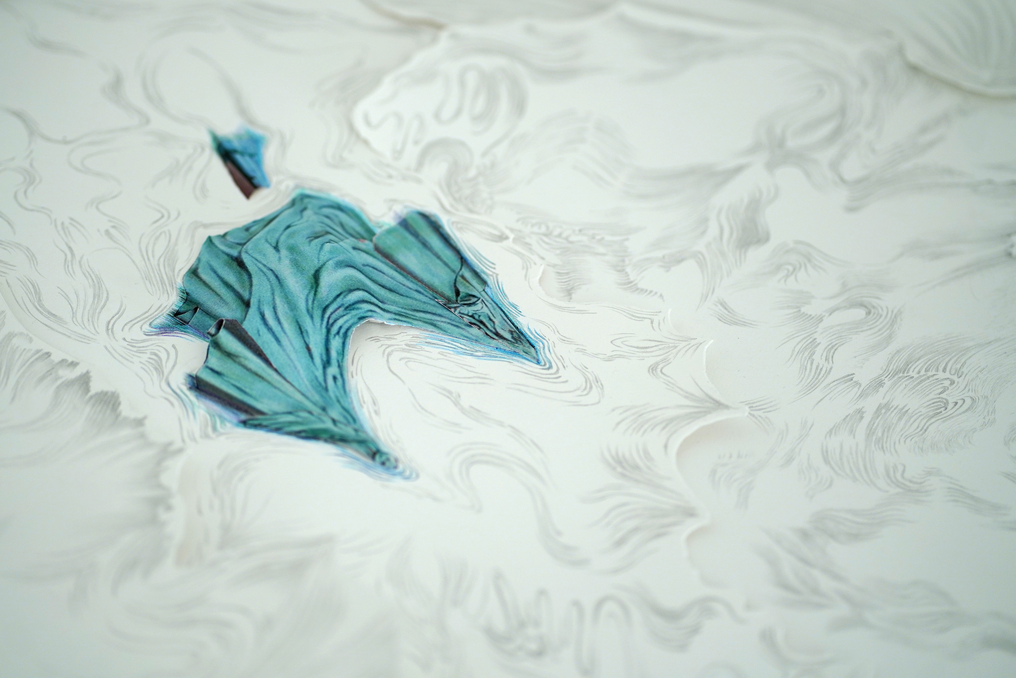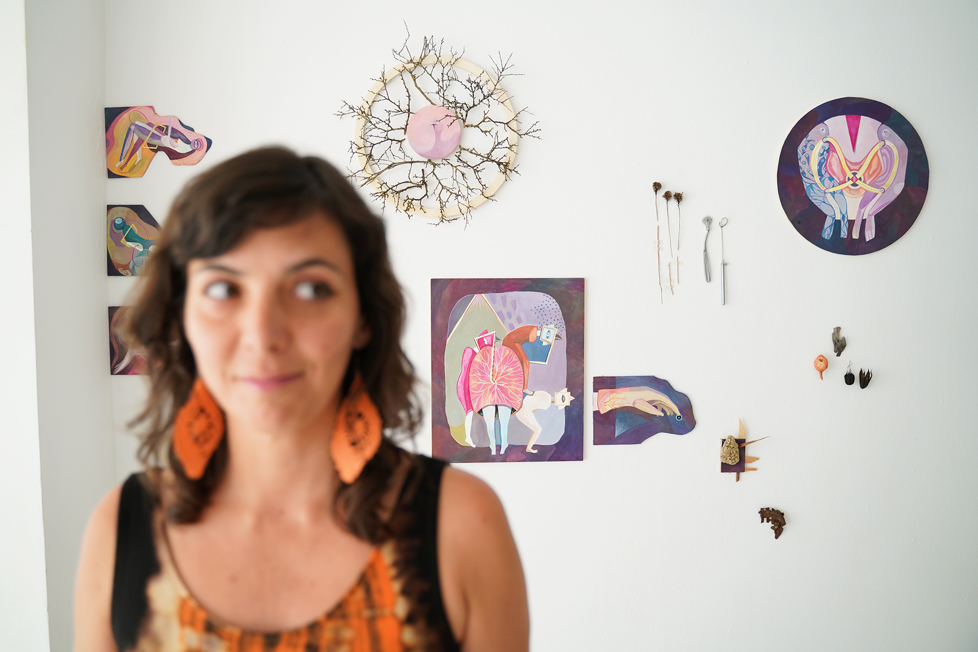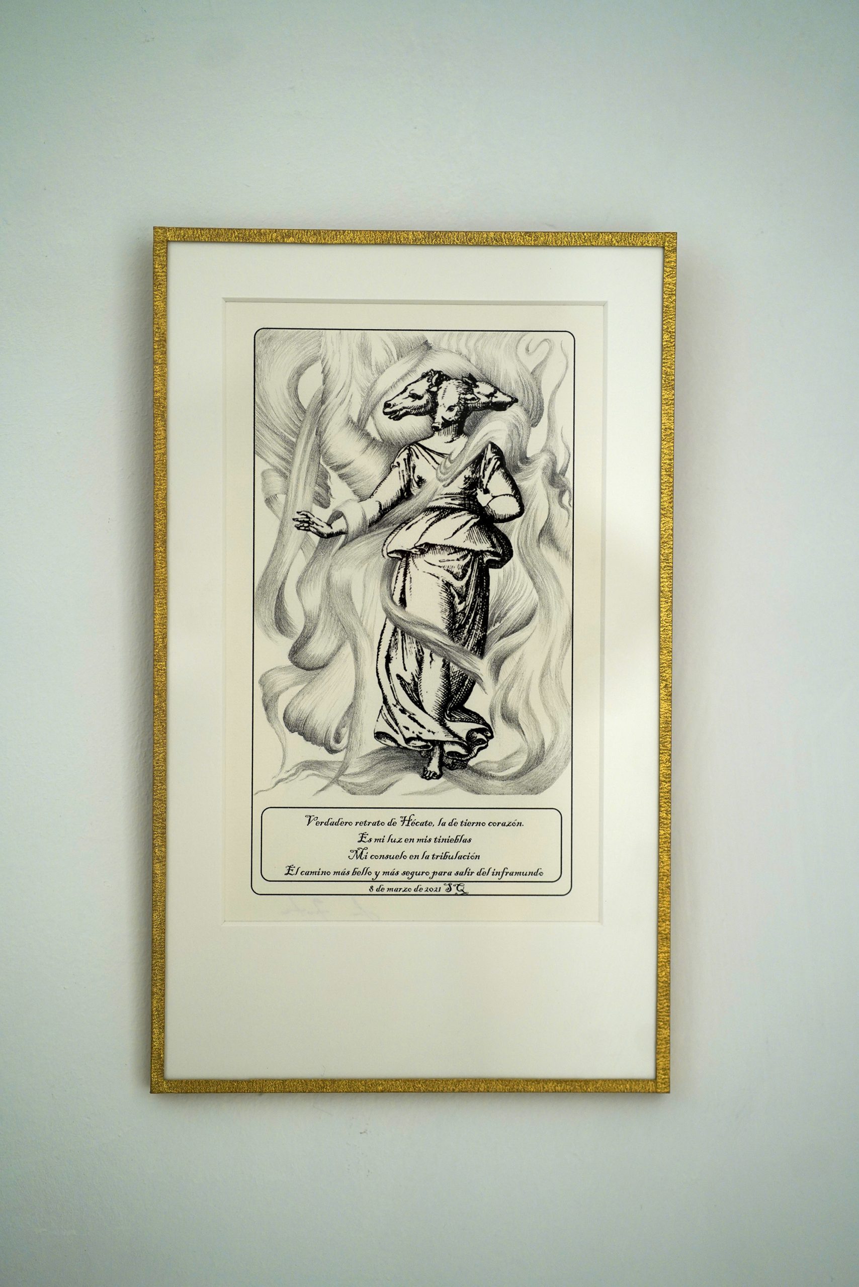 Bajo el binomio arte y ecología, Lucía Loren (Madrid, 1973) crea espacios como El Jardín de Deméter donde las alegorías asociadas a la fertilidad, la abundancia y el alimento se materializan en colmenas para propiciar la polinización y un jardín de melíferas que refuerzan la eco-dependencia del mundo natural y la cultura cíclica. Por su parte, Alba Soto (Madrid, 1981) en la serie Semilla, Llama, Penumbra recurre a una suerte de mapa con centros compartidos, obligos y corazones desde los que respirar circular y colectivamente. Sara Quintero (Madrid, 1971) regresa a la mitología griega con Yo elevo mi faro III con un dibujo de grandes dimensiones donde evoca las olas del mar Mediterráneo, escenario de la actual crisis de refugiados, con la estatua de la libertad, una de las representaciones de Hécate. A partir de dicha diosa, Quintero presenta Estampa devocionaria de Hécate y Detente bala, el corazón de Hécate está conmigo, donde se apropia de la iconografía religiosa para plantear una reflexión sobre las actuales políticas sociales.