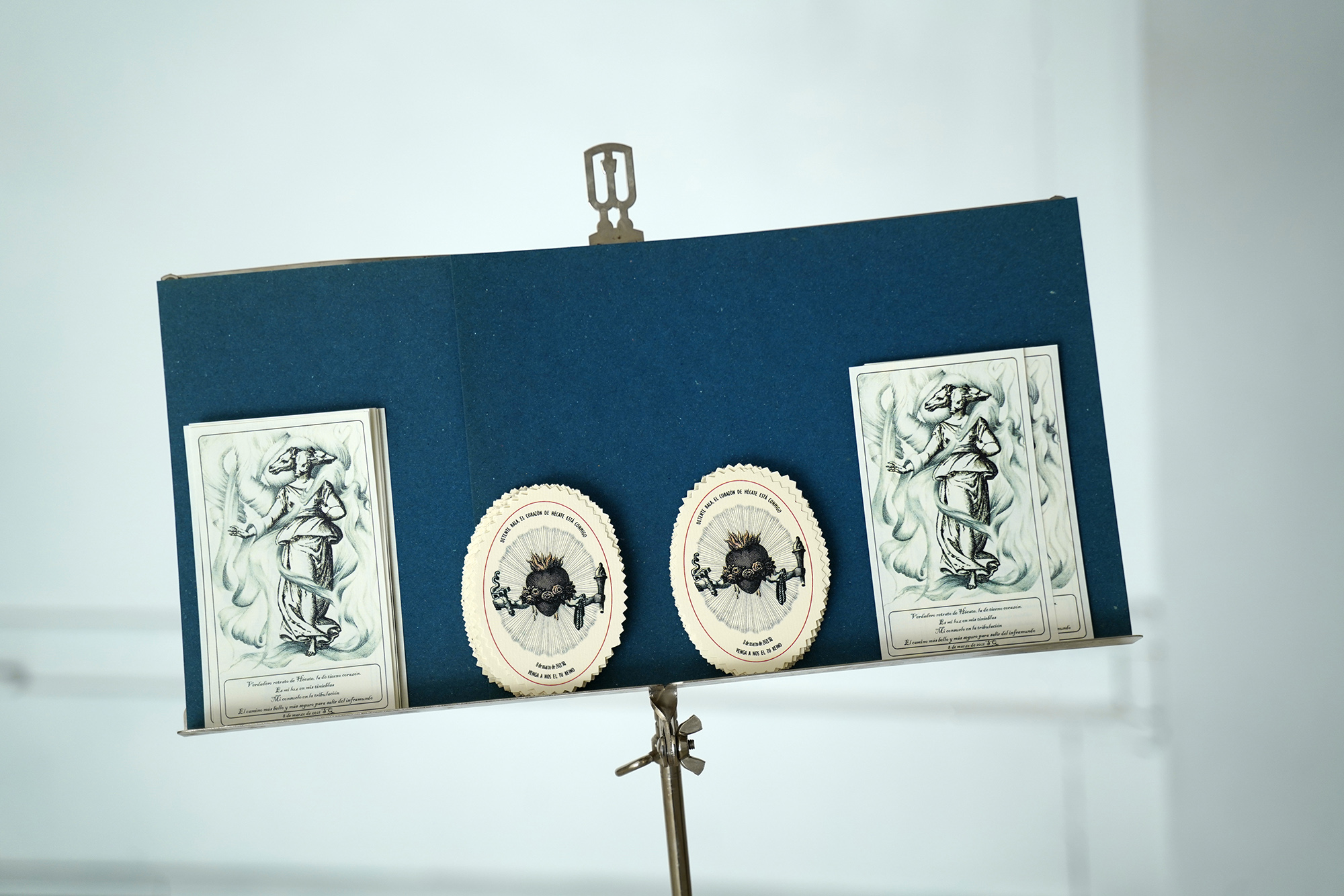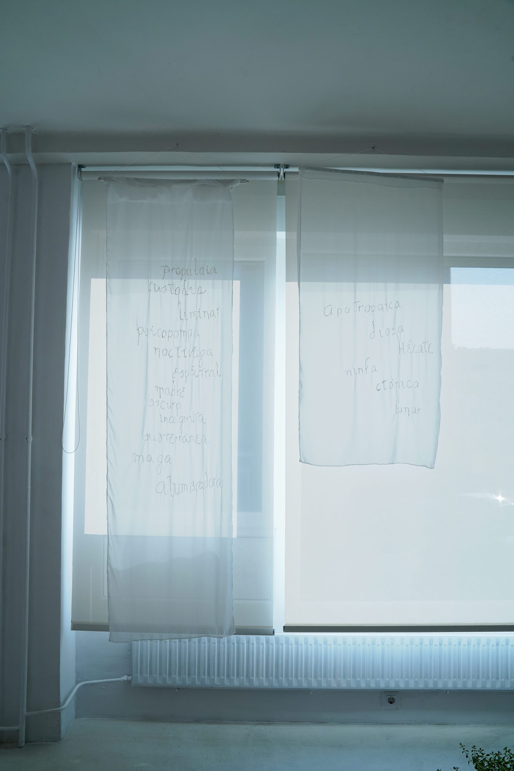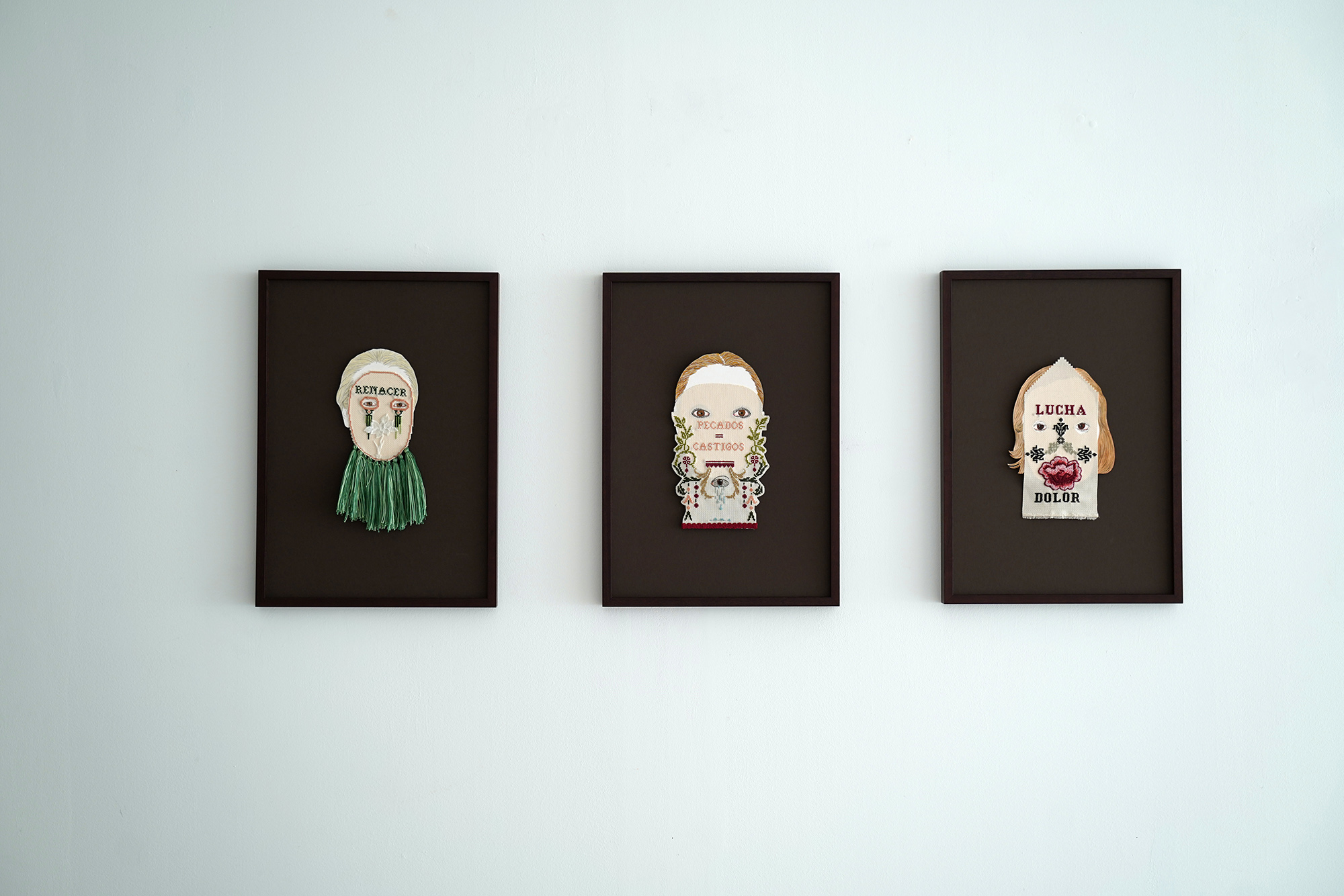 En ese sentido, las dos obras de Kika Beneyto (Madrid, 1971), Círculo mágico y Las mil veces única, citan el mito de Deméter revisando la idea del ciclo y transformación a través del círculo y la granada. Estefanía Martín Sáenz (Bilbao, 1982) en su serie Máscaras exhibe los miedos, pecados y castigos de las mujeres del pasado hilvanado historias hábilmente entretejidas en el contexto actual. La literatura, la palabra, es la materia invocada por Amelia Meléndez (París, 1974) en los Yambos para unas Tesmoforias, cuyos poemas visuales titulados Apotropaica diosa y Propulaia custoria liminal derivan de la literatura del mito.