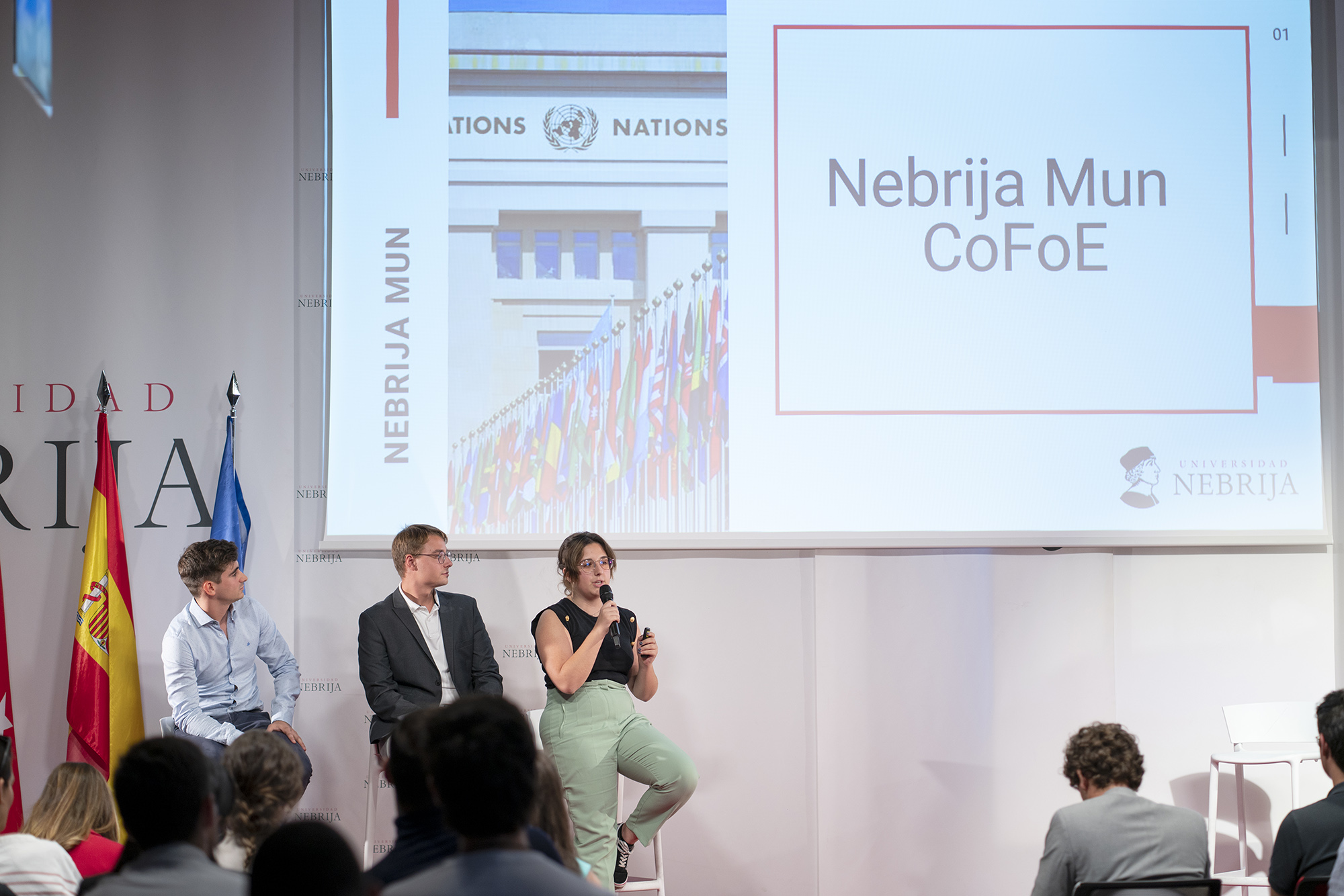 Para cerrar el acto, tres miembros de NebrijaMUN, una asociación formada por alumnos del grado en Relaciones Internacionales de la Facultad de Derecho y de Relaciones Internacionales de la Universidad Nebrija, explicaron los detalles del MEU (Model of European Union) que organizaron en el marco de la Conferencia por el Futuro de Europa (CoFoE) los días 28 y 29 de abril. En este evento, un total de 60 alumnos de todos los cursos de Relaciones Internacionales simularon, en la Asamblea de Madrid, ser representantes de partidos políticos, de instituciones y ciudadanos europeos, defendiendo sus posturas en torno al futuro de Europa en una sesión plenaria. Debatieron sobre cuestiones reales como los valores de la democracia europea, los nacionalismos, la inmigración, el terrorismo, el crimen organizado o los derechos de los ciudadanos y los colectivos. La asociación vinculada a la Universidad Nebrija ya está perfilando la edición de 2023.
