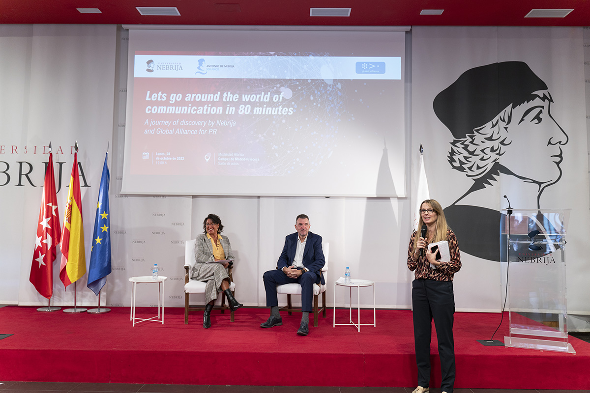 Con motivo de la alianza entre la Universidad Nebrija y Global Alliance, la mayor confederación de profesionales de Relaciones Públicas del Mundo, ocho expertos internacionales realizaron un workshop junto a los estudiantes de la Facultad y Comunicación y Artes. Bajo el lema de “dar la vuelta al mundo de la comunicación en 80 minutos”, los alumnos pudieron asomarse en una enriquecedora conferencia a algunos de sus principales desafíos. El acto estuvo moderado por José Manuel Velasco, miembro del Comité Ejecutivo de Global Alliance, y Virginia Navarro, profesora del grado en Comunicación Corporativa, Protocolo y Organización de eventos de Nebrija.