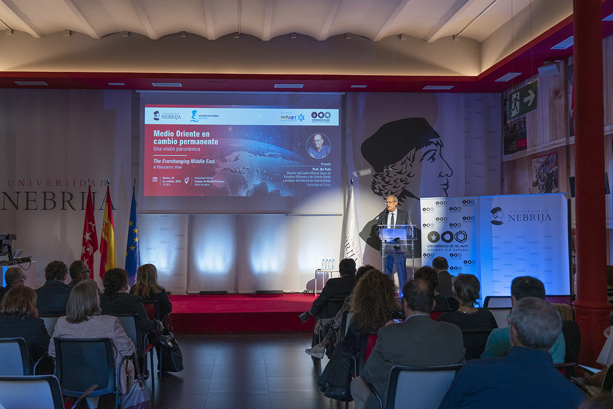 Estamos, atendiendo a estos parámetros locales y globales, ante “una ecuación global que está cambiando de forma dramática, y cada actor cambia con estas circunstancias”. La denominada Primavera Árabe, los intereses de Irán -“el gato persa que mira a Irak, Siria y Líbano”- y el terrorismo yihadista son otros de los condicionantes de un puzle “complejo”, que, como apuntó Gregorio Martínez, director de la Fundación Nebrija y director de Relaciones Institucionales de la Universidad Nebrija, exige análisis y debate. En el acto celebrado en el Campus de Madrid-Princesa también agradecieron la presencia de Uzi Rabi Alfonso López de la Osa, decano de la Facultad de Derecho y de Relaciones Internacionales, y Patricia Nahmad, presidenta de la Asociación de Amigos de la Universidad de Tel Aviv en España, que en mayo suscribió un convenio para la puesta en marcha de diferentes programas de colaboración con la Universidad Nebrija.