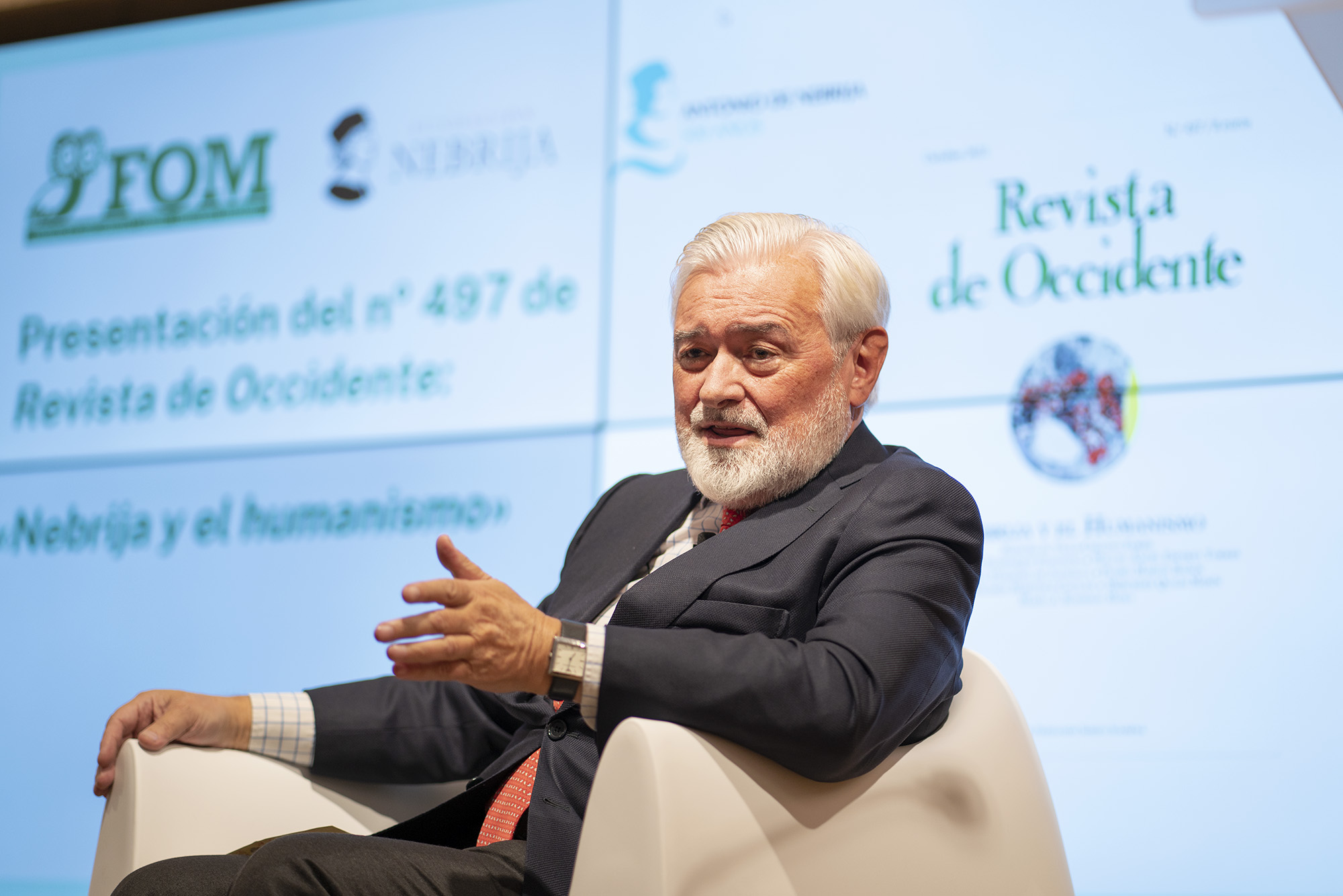 Moderada por María Gil, directora de Comunicación de la Universidad Nebrija y en un recién estrenado salón de actos de la Fundación, la conferencia comenzó con las palabras de agradecimiento de José Muñiz. El rector de la universidad subrayó en su discurso lo que supone para la figura de Nebrija que una revista centenaria, que ha sobrevivido a dos dictaduras y a una Guerra Civil, le dedique un monográfico. “Antonio de Nebrija bien merece todas las conmemoraciones, ahora bien, es todo un honor que una revista que aún mantiene vivos los principios que la vieron nacer en 1923, una revista que sigue ahí, incólume, siendo un faro de la cultura y las ciencias españolas le dedique un número”.