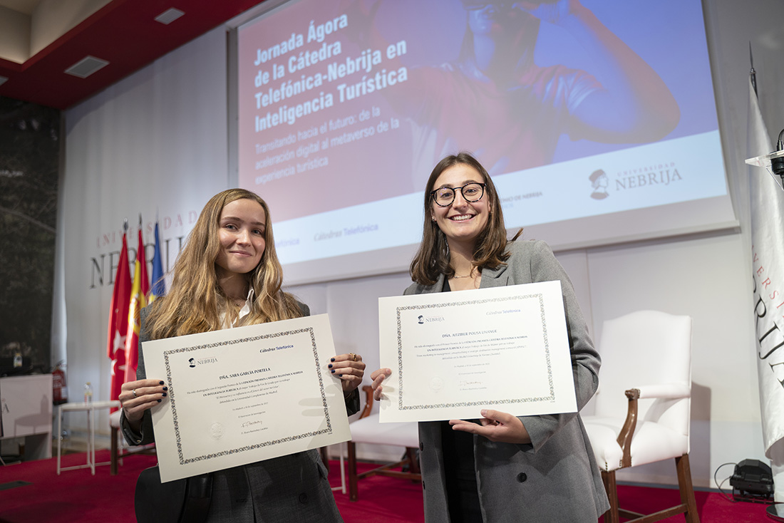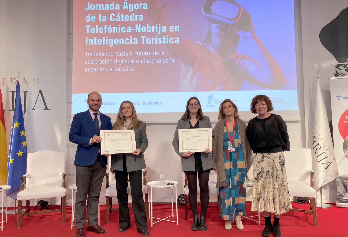 Después del debate abierto, Alejandro Chinchilla, responsable de Relaciones con Universidades y Cátedras Telefónica, y Ana Fernández-Ardavín, decana de la Facultad de Economía y Empresa de la Universidad Nebrija, otorgaron la primera edición de los Premios Cátedra Telefónica Nebrija en Inteligencia Turística a Aitziber Pousa Unanue -distinguida con el primer premio al mejor Trabajo Fin de Máster por su trabajo From marketing to management: conceptualizing a strategic destination management scorecard (SDMSC), defendido en la Modul University de Viena (Austria)- y a Sara García Portela -distinguida con el segundo premio de la presente edición al mejor Trabajo Fin de Grado por su trabajo El Metaverso y su influencia en el futuro del sector turístico, defendido en la Universidad Complutense de Madrid-.