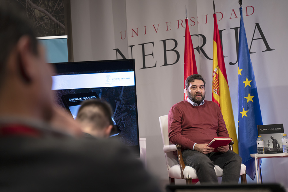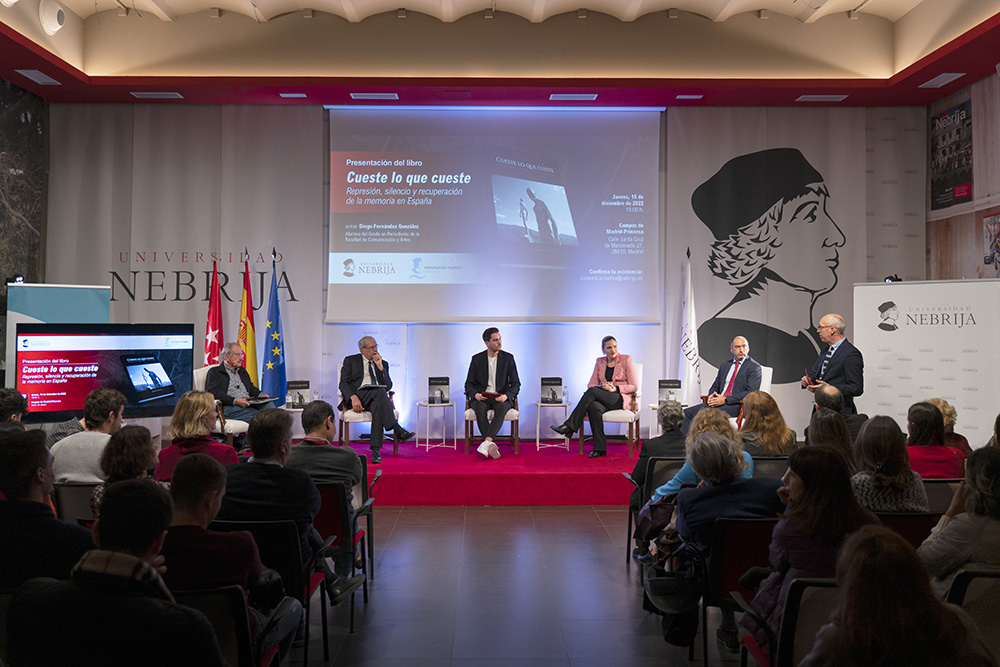La Facultad de Comunicación y Artes presentó en el salón de actos del campus de Princesa el libro Cueste lo que cueste de Diego Fernández, un volumen que brota de su Trabajo Fin de Grado (TDF). El autor, en la puesta de largo de su primer trabajo como fotoperiodista, estuvo arropado por Gregorio Martínez, director de la Fundación Antonio de Nebrija; Marta Saavedra, vicedecana de la facultad; Óscar Rodríguez, sociólogo; Andrés Ballesteros, jefe de la sección de fotografía de la agencia EFE y por Eduardo Castillo, director del Grado de Periodismo que hizo las veces de maestro de ceremonias.