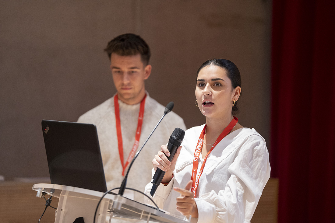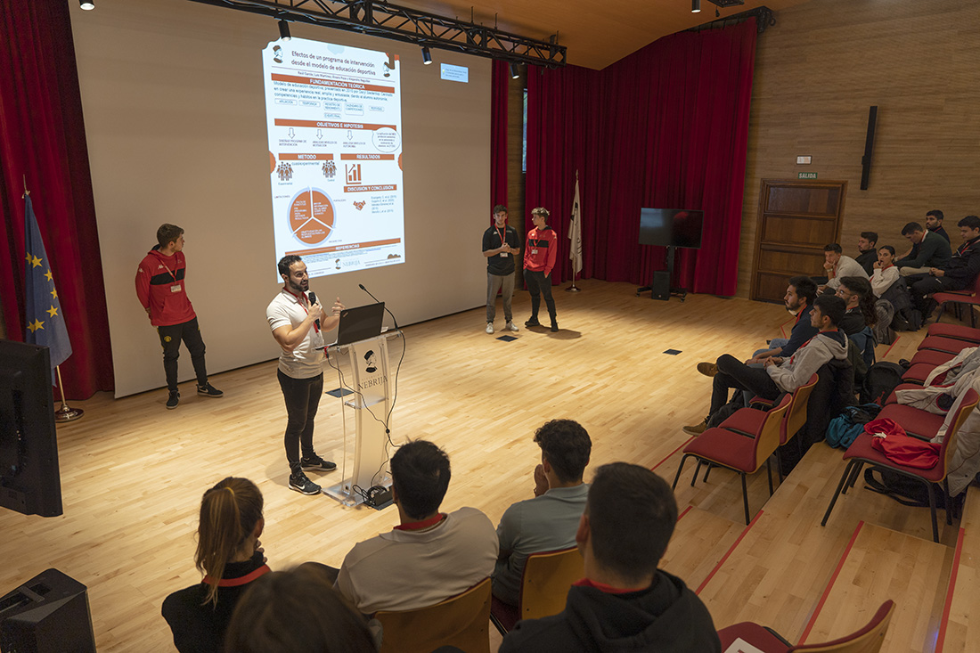 El resto, convertidos en congresistas por un dia, elaboraron un diseño de investigación cuasiexperimental, atendiendo a las áreas seleccionadas, y una diapositiva póster para su presentación y defensa en el auditorio. Los congresistas podían elegir entre cuatro áreas temáticas: Innovación en Educación Física (TIC y modelos pedagógicos), Actividad física y promoción de la salud en el contexto educativo, Actividad física y deporte inclusivo en las clases de Educación Física y Educación física y creatividad. Así surgieron siete grupos de trabajo que presentaron sus trabajos de investigación ante el Comité Científico. “Me gustaría señalar la importancia de la implementación de evaluaciones triádicas (autoevaluaciones, coevaluaciones y heteroevaluaciones), donde se establecen varios momentos de retroalimentación, guiados y supervisados por los docentes. Esta cesión de autonomía en el aporte de feedback supone una estrategia win to win, donde el alumnado que ejerce labores de corrección, en este caso el Comité Científico, debe conocer el contenido y las finalidades que deben alcanzar sus compañeros evaluados, los congresistas”, subrayó el profesor de Didáctica de la Educación Física.
