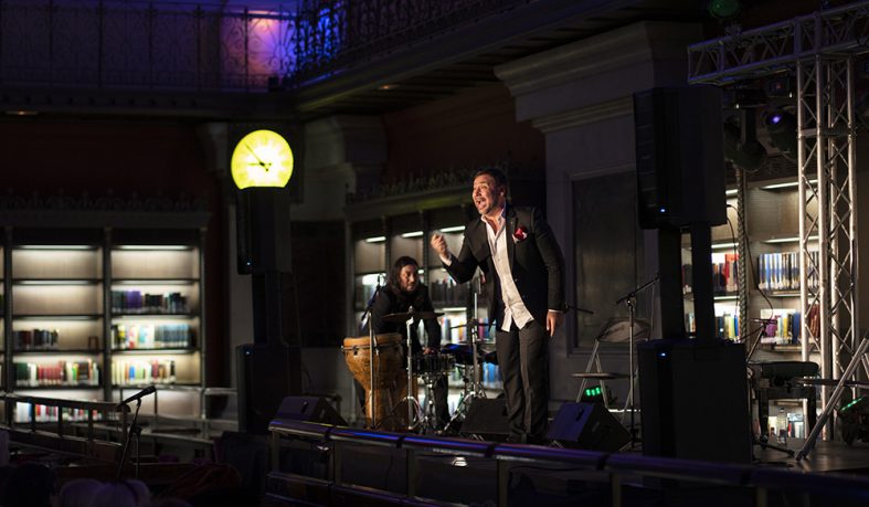 José Valencia, nacido en Barcelona en el seno de una familia gitana de Lebrija, se siente “muy orgulloso de estar en este templo” de la Biblioteca Nacional de España, e interrumpe sus cantos para dedicar un sentido homenaje a Antonio de Nebrija, “la persona que nos alumbró la vida y el camino”. Recoge la alegría de celebrar al sabio expresada por Ana Santos, directora de la BNE: “¡Qué gusto da ver a tanta gente en este concierto memorable!”. Al final, el público aplaude la osadía por divulgar a Nebrija desde el flamenco y con ribetes en latín. Seguramente el propio profesor Nebrija hubiera llevado a sus alumnos de la Universidad de Salamanca o a los de Alcalá de Henares a esta actividad extraordinaria y a la exposición Nebrija (c. 1444-1522), el orgullo de ser gramático que reposa, ávida de visitantes, al lado de la Sala de Lectura María Moliner.