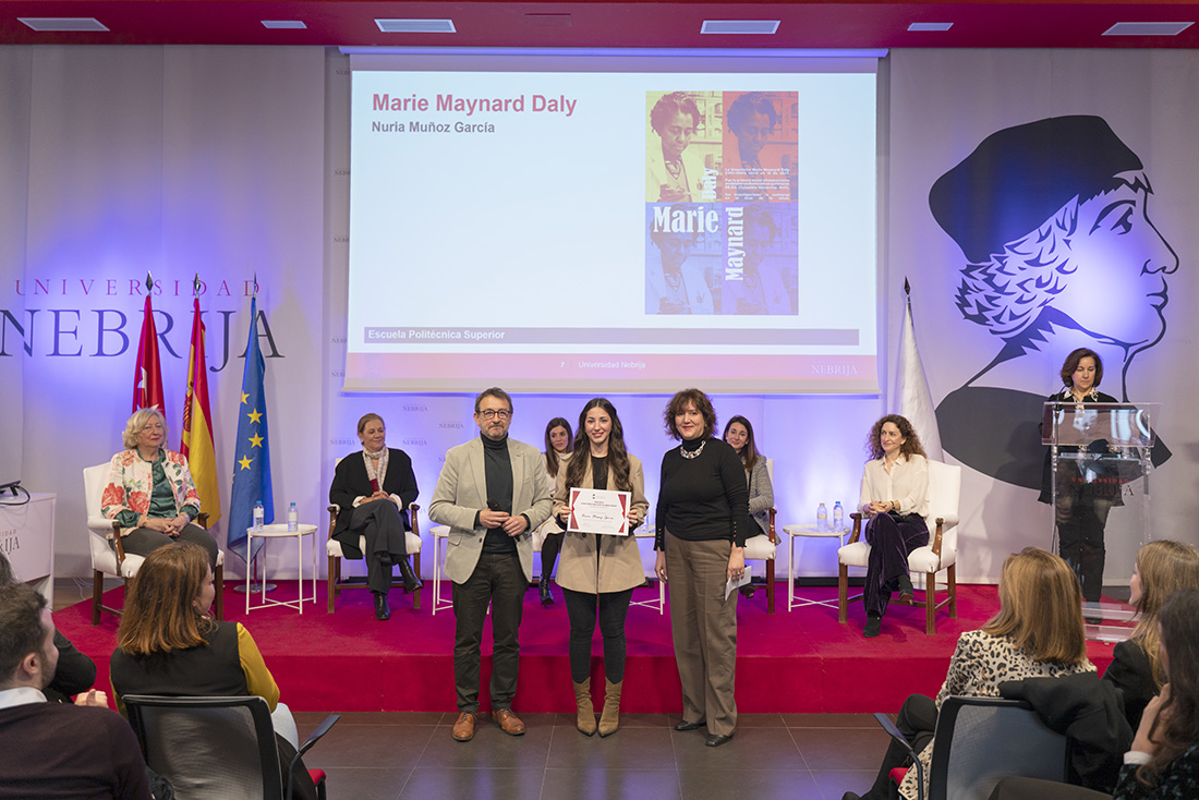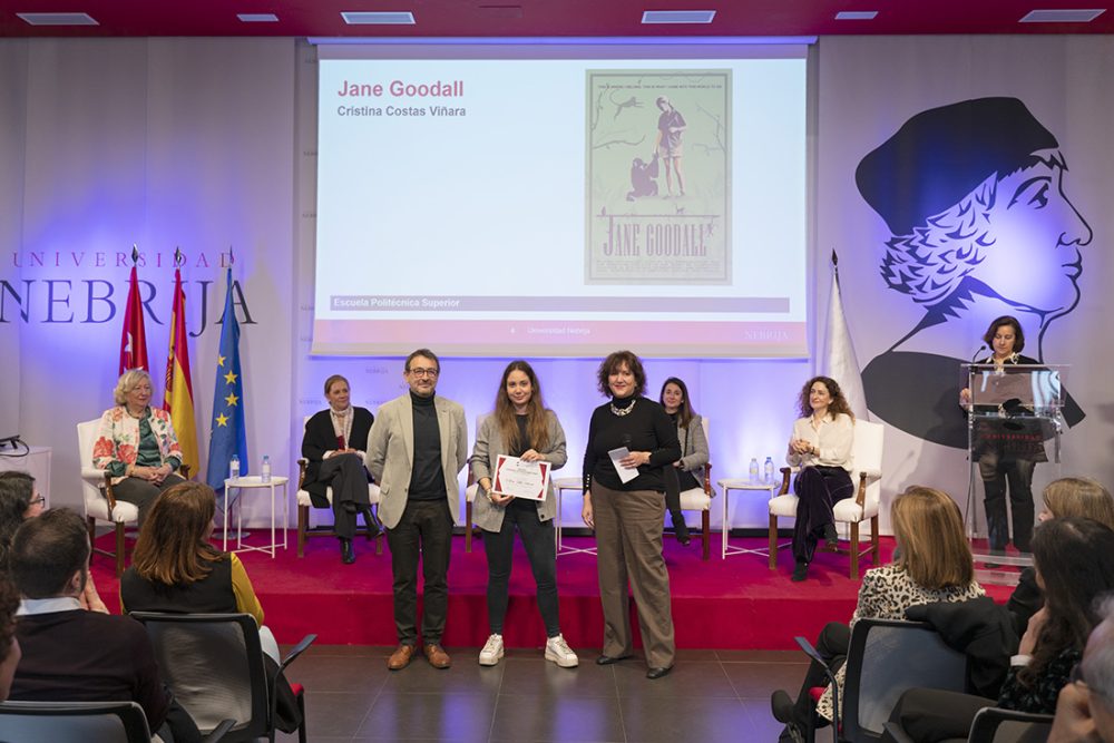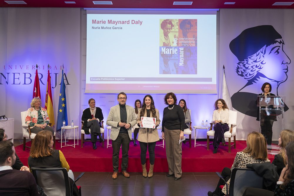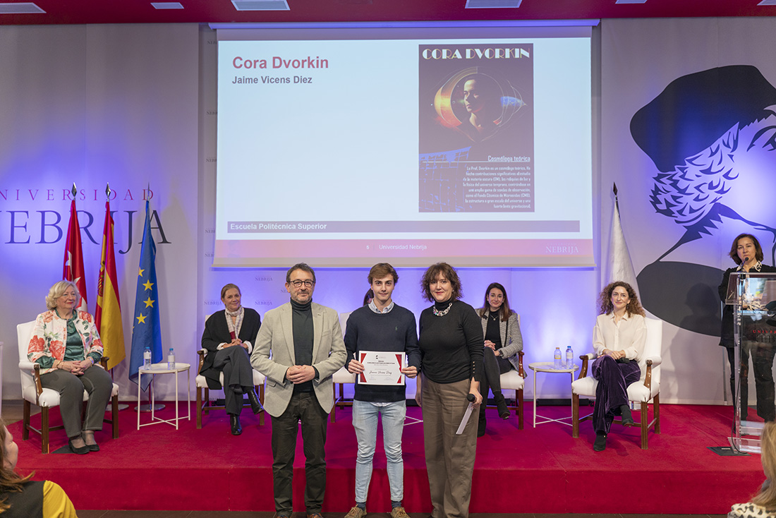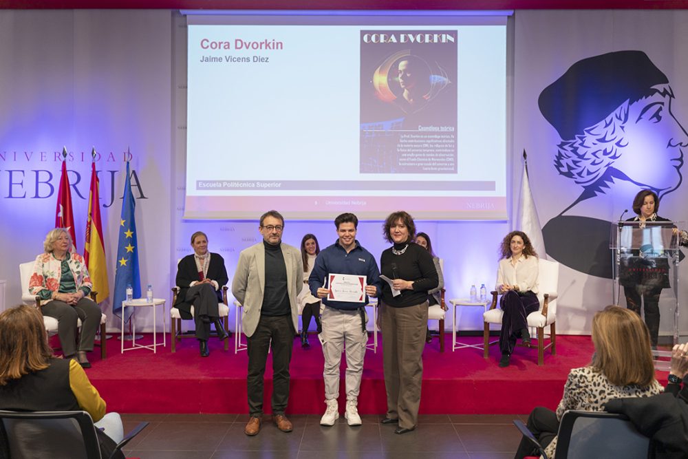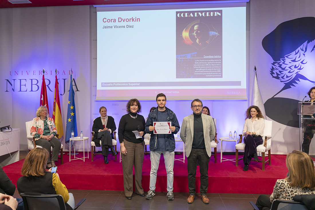 En la jornada de la Universidad Nebrija, las profesoras Pilar Vélez, exrectora de la Universidad Nebrija, y Alexandra Delgado y Juan Carlos Arroyo, decano de la Politécnica Nebrija, entregaron los diplomas del concurso del Día de la Mujer y de la Niña en la Ciencia a los alumnos Jaime Vicens -primer premio-, Javier Jiménez, Ignacio García, Cristina Costas y Nuria Muñoz, que recrearon la figura de las siguientes científicas: Cora Dvorkin, Asha de Vos, Katalin Karicó, Jane Goodall y Marie Maynard Daly. Más referentes.