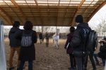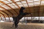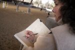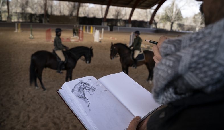 Los jinetes de la Guardia Real montan tres tipos de caballos: pura raza español, de deporte español e hispano-bretón. Los alumnos y los profesores del Máster acudieron, acto seguido, al encuentro de ejemplares de los dos primeros tipos. En el picadero, subidos a una grada lateral, tuvieron el privilegio de dibujar sus bocetos mientras los militares practicaban la monta o incluso posaban como estatuas con sus caballos para que los aprendices pudieran captar todos los detalles. Erick Miraval no paró de darles consejos: “Esa pata izquierda ha de servir de eje, suelta la cintura”; “fijaos bien en las capas”; “atención al tamaño de la cabeza, reduce el torso”; “has dibujado una nariz picassiana al caballo”, “resalta la línea de las patas”…
