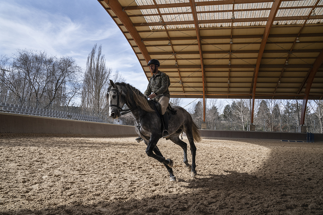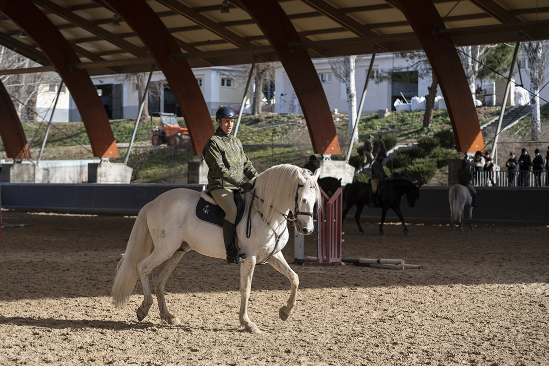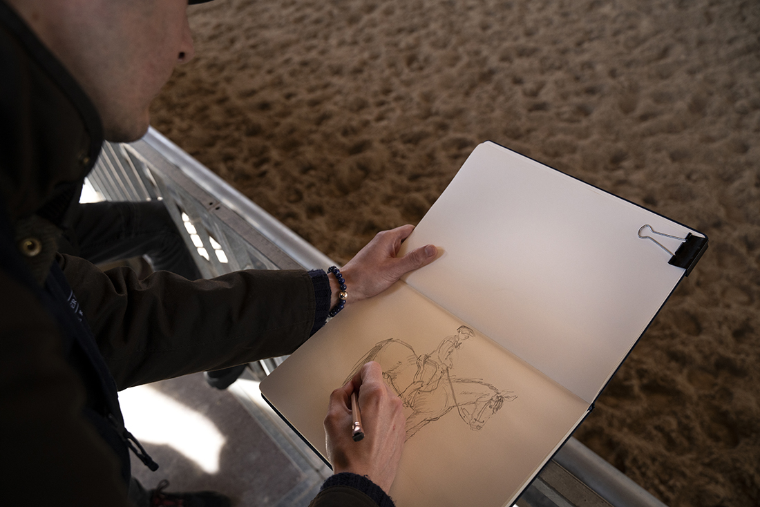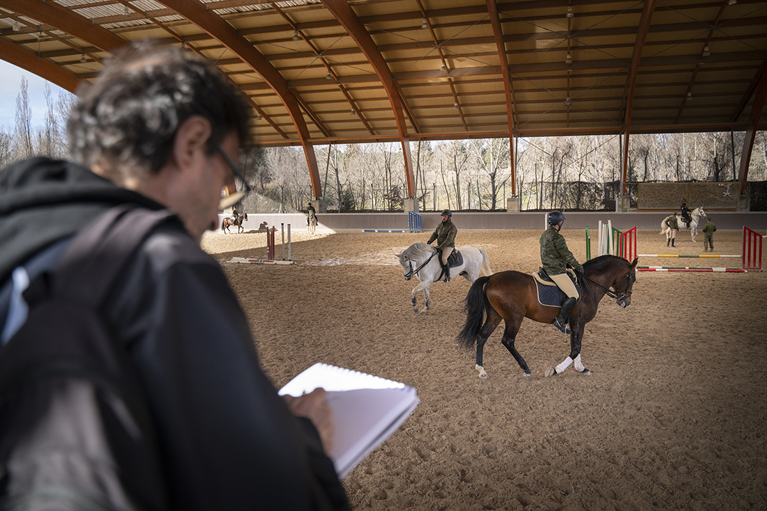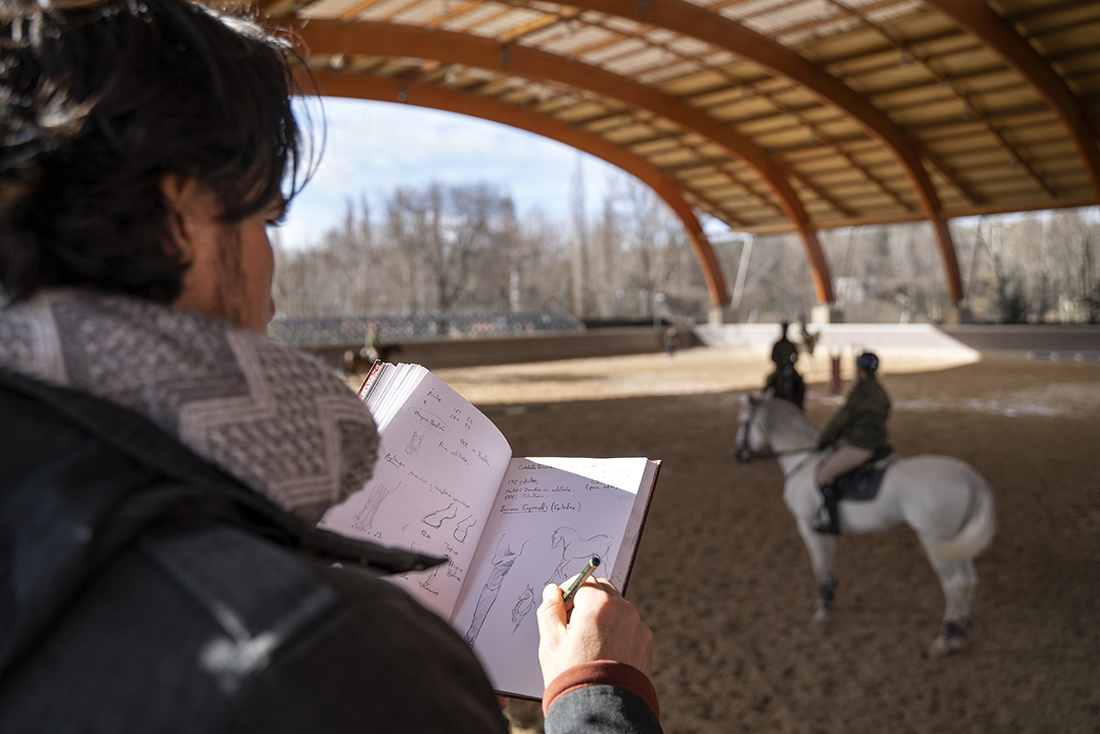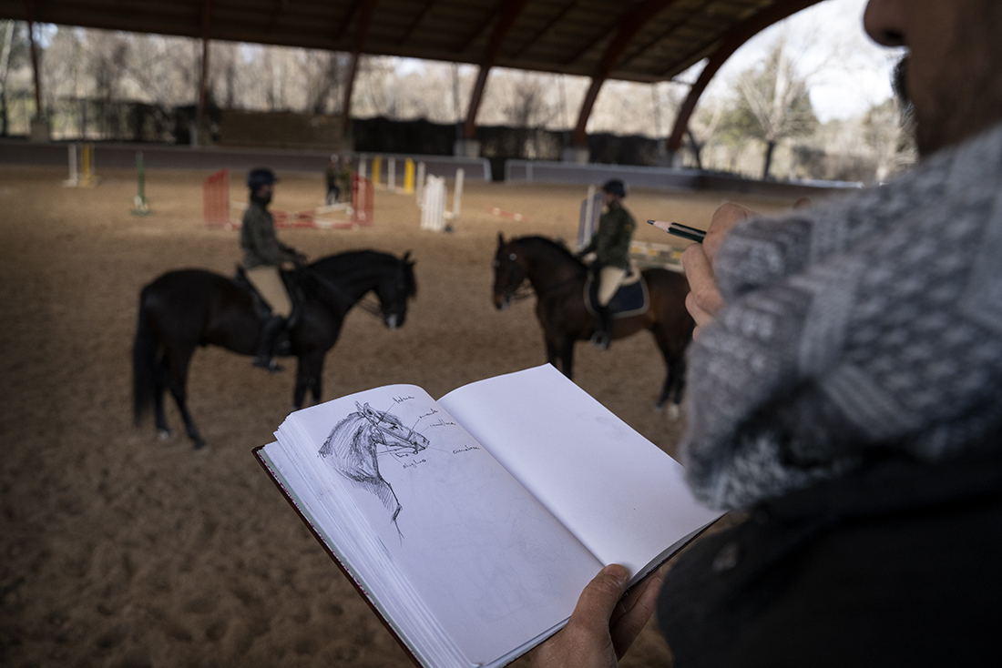 Los jinetes de la Guardia Real montan tres tipos de caballos: pura raza español, de deporte español e hispano-bretón. Los alumnos y los profesores del Máster acudieron, acto seguido, al encuentro de ejemplares de los dos primeros tipos. En el picadero, subidos a una grada lateral, tuvieron el privilegio de dibujar sus bocetos mientras los militares practicaban la monta o incluso posaban como estatuas con sus caballos para que los aprendices pudieran captar todos los detalles. Erick Miraval no paró de darles consejos: “Esa pata izquierda ha de servir de eje, suelta la cintura”; “fijaos bien en las capas”; “atención al tamaño de la cabeza, reduce el torso”; “has dibujado una nariz picassiana al caballo”, “resalta la línea de las patas”…