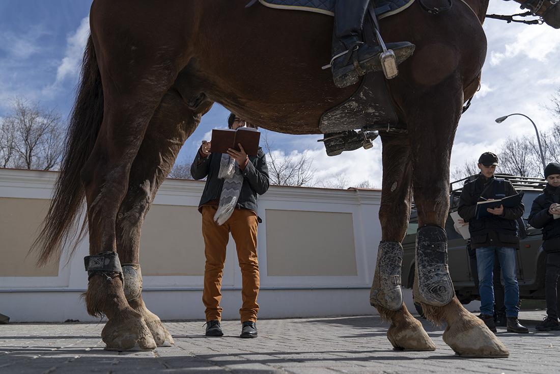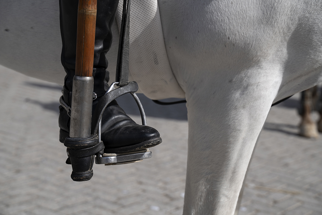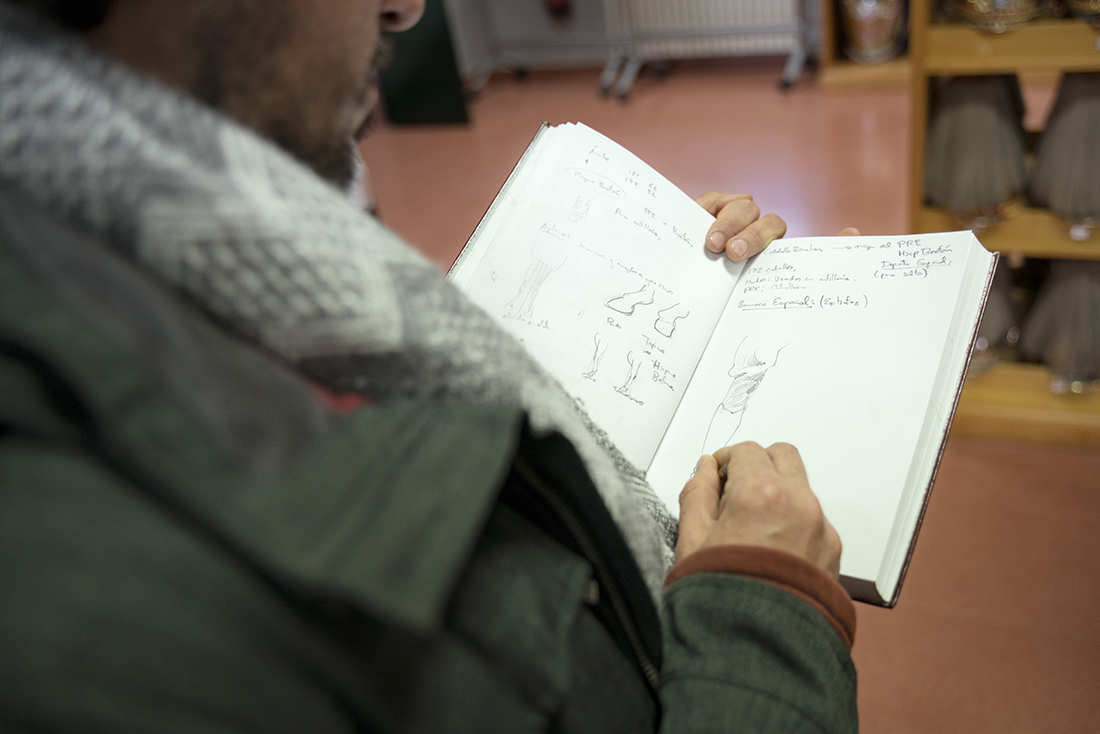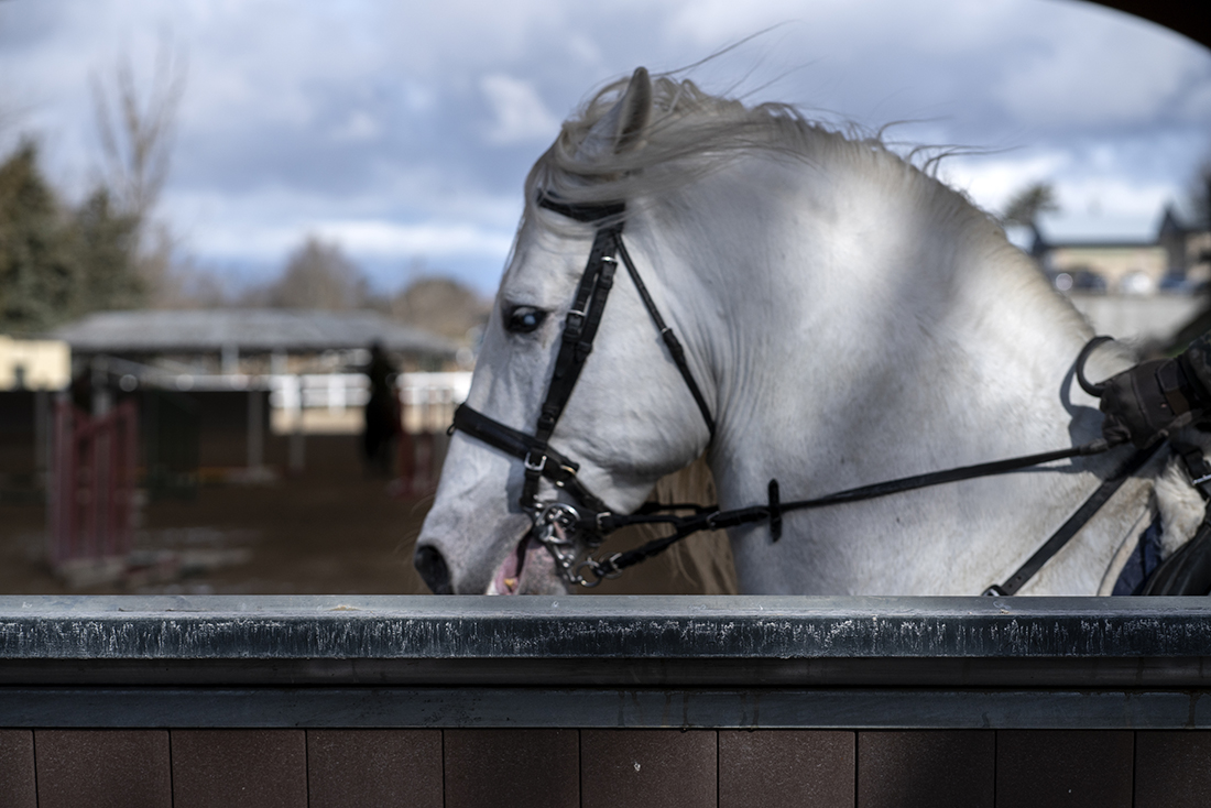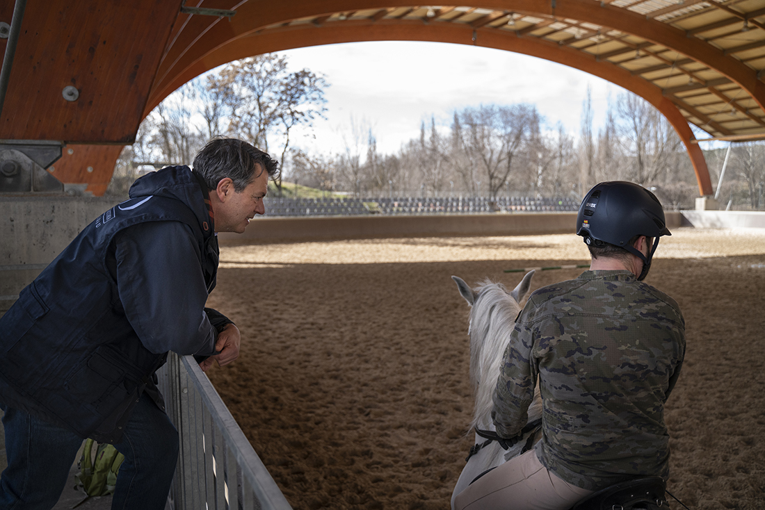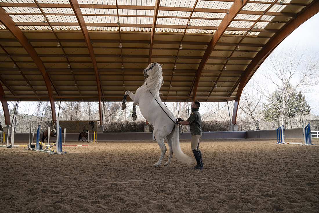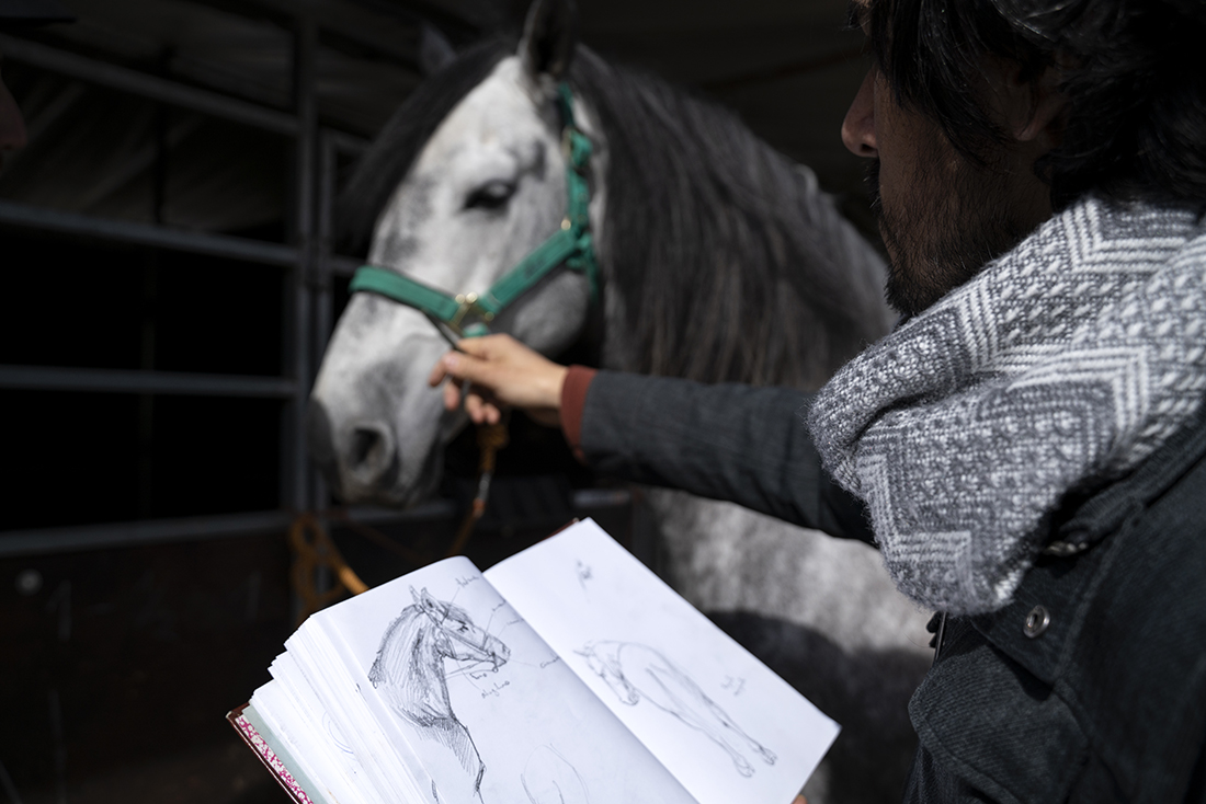 Los jinetes de la Guardia Real montan tres tipos de caballos: pura raza español, de deporte español e hispano-bretón. Los alumnos y los profesores del Máster acudieron, acto seguido, al encuentro de ejemplares de los dos primeros tipos. En el picadero, subidos a una grada lateral, tuvieron el privilegio de dibujar sus bocetos mientras los militares practicaban la monta o incluso posaban como estatuas con sus caballos para que los aprendices pudieran captar todos los detalles. Erick Miraval no paró de darles consejos: “Esa pata izquierda ha de servir de eje, suelta la cintura”; “fijaos bien en las capas”; “atención al tamaño de la cabeza, reduce el torso”; “has dibujado una nariz picassiana al caballo”, “resalta la línea de las patas”…