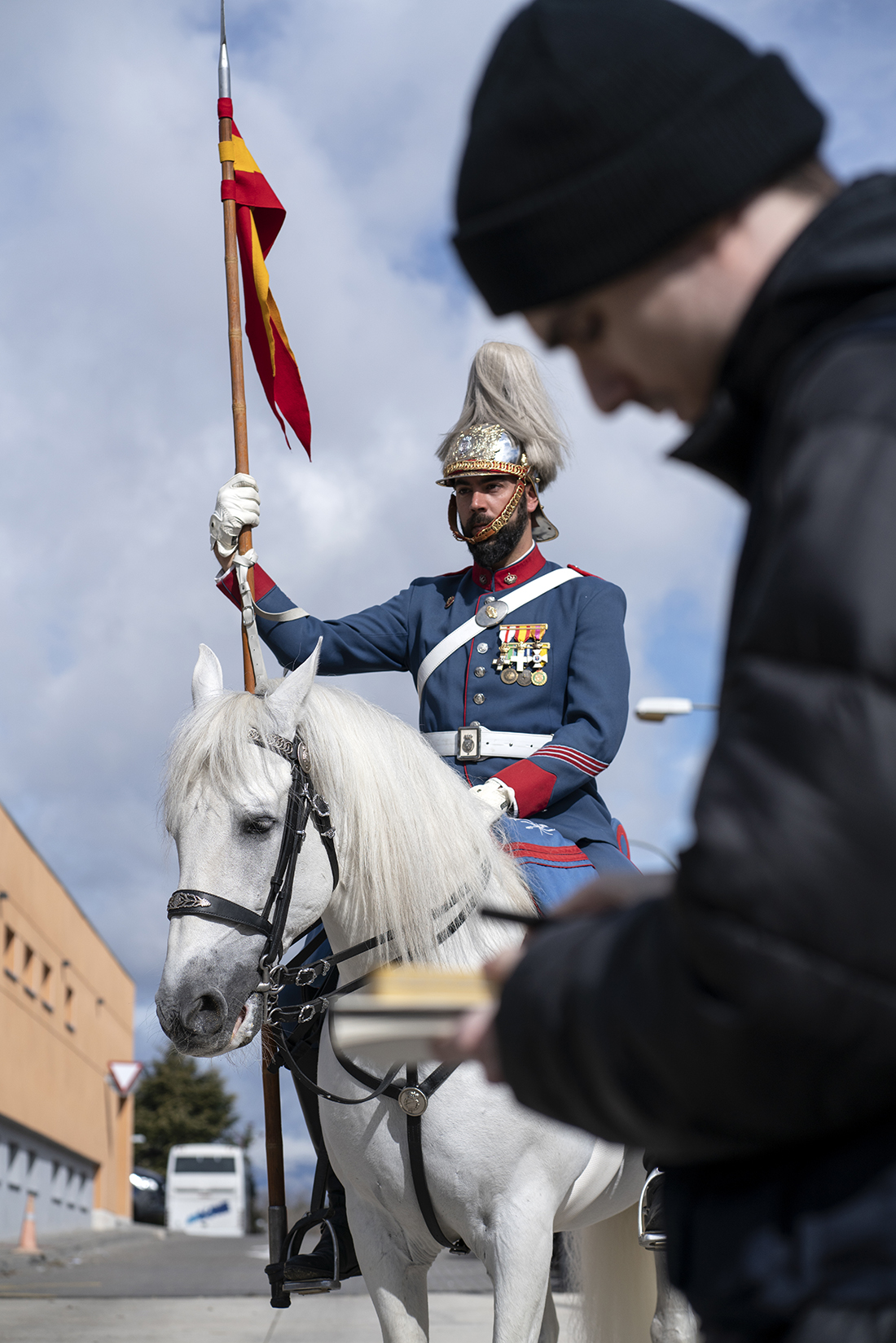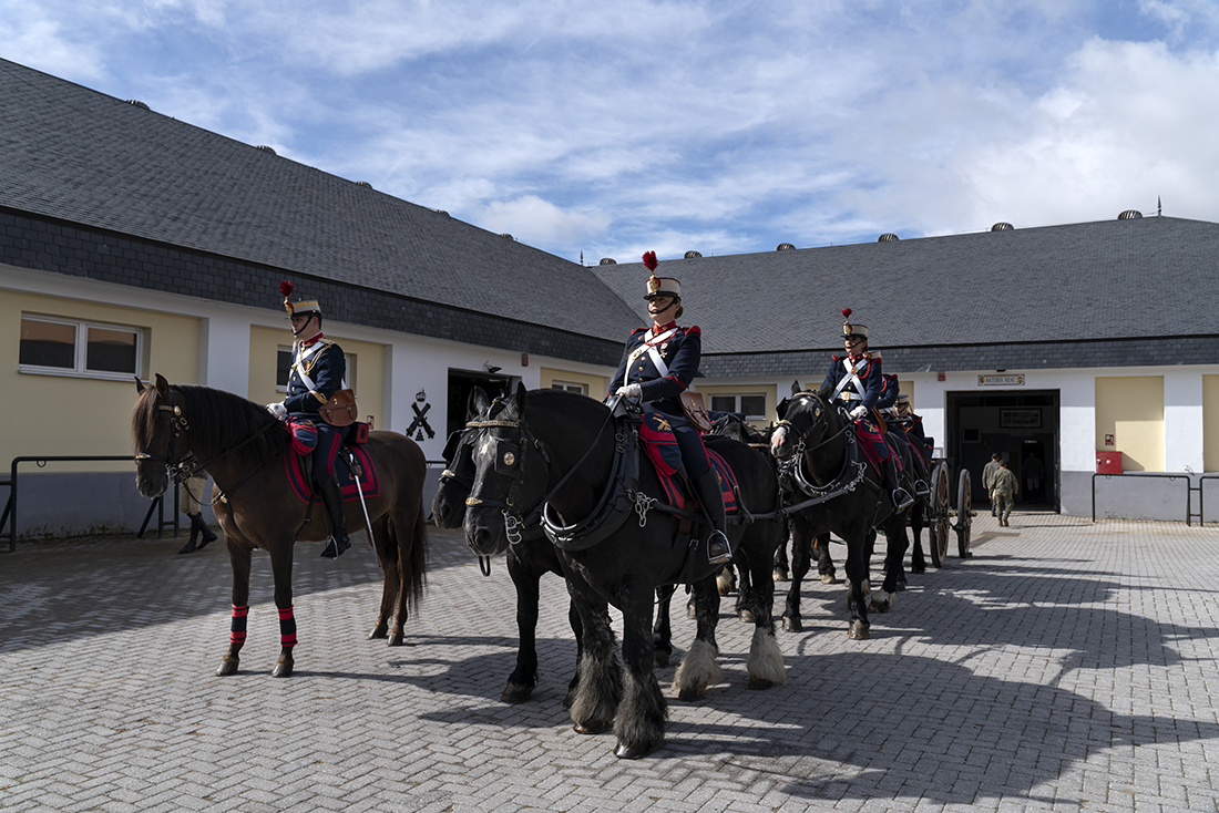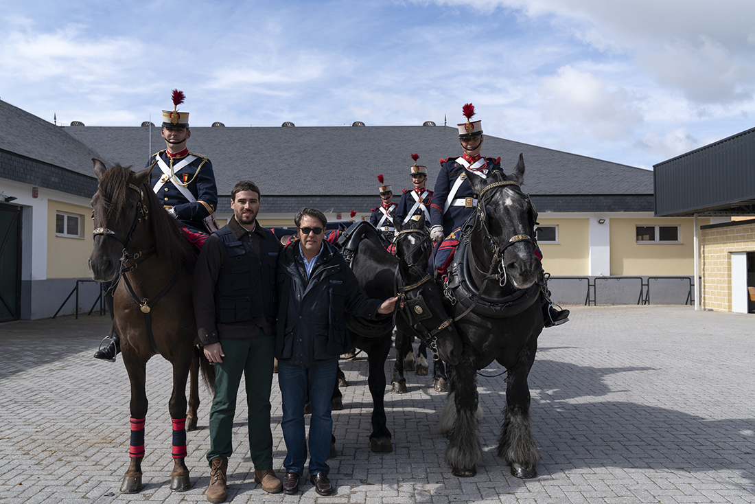 Un lancero, un coracero y artilleros flanqueando un tiro de una pieza de artillería tirado por ejemplares hispano-bretones pusieron la guinda a la visita. La vestimenta de gala y la quietud de los animales y los jinetes conformaron una combinación perfecta para la lección en vivo.