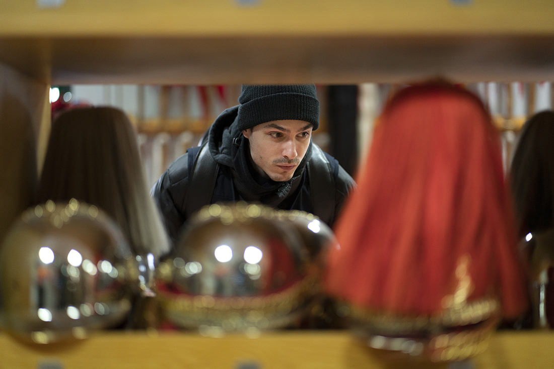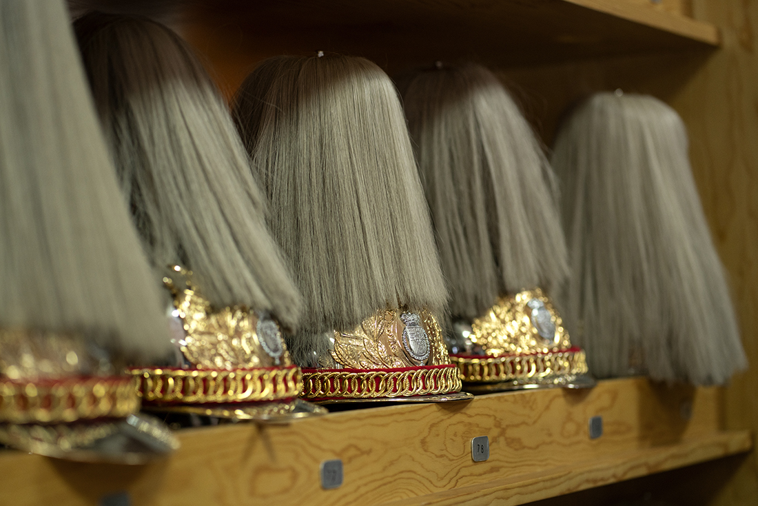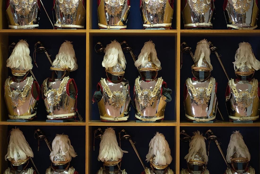 Con las mentes llenas de datos e imágenes, los pintores del Máster se dirigieron a la Sala de Corazas, un auténtico “museo almacén” donde pudieron observar de primera mano todos los aparejos y el vestuario de los guardias reales. Aprendieron que la escuadra de batidores, la banda de clarines y timbales, la sección de coraceros y la sección de lanceros forman el grueso de la comitiva que escolta al Rey o a los miembros de la Familia Real o participan en actos como la presentación de credenciales de los nuevos embajadores. Los cascos de coracero -que no permiten una cabeza de grandes dimensiones- y los timbales, a cuyo estridente sonido se tiene que acostumbrar los caballos, acapararon la curiosidad de los pintores.