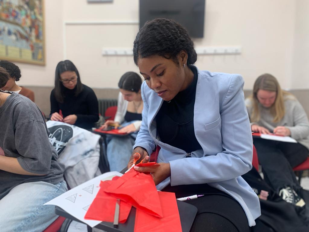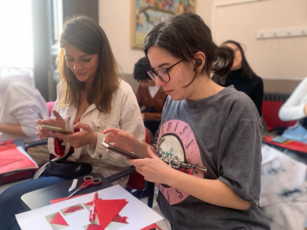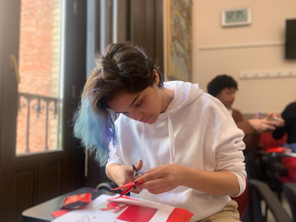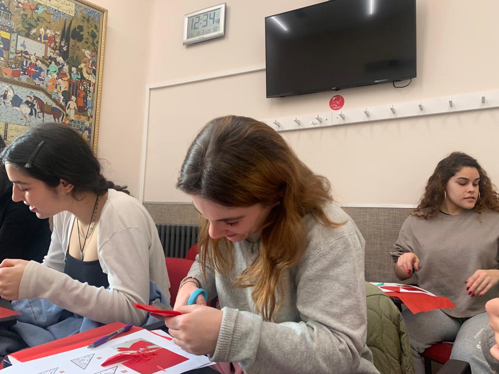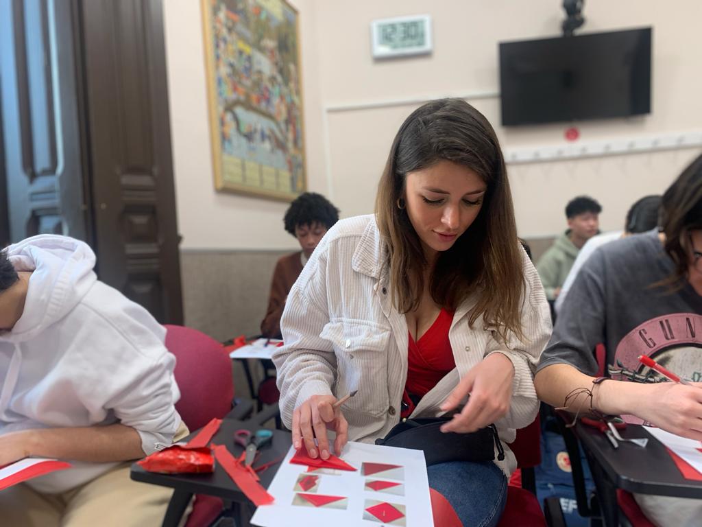 Para la actividad principal de este taller, Li y Ying mostraron a los alumnos una de las grandes tradiciones chinas, el papel cortado (jianzhi). Se trata de una expresión artística que se remonta al siglo II d.C. Un arte hecho con materiales muy simples (papel y navaja de corte o tijeras), pero que requiere de mucha destreza, habilidad y sensibilidad artística. Es un arte ancestral que fue declarado Patrimonio Inmaterial de la Humanidad por la UNESCO.