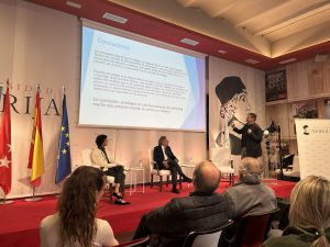 Agustín Elbaile, presidente de la Academia de la Publicidad; Marta Perlado, decana de la Facultad de Comunicación y Artes; y el profesor Fernando Montañés han presentado hoy la investigación La respuesta a los eslóganes de marcas en idiomas nativo y no nativos, que analiza la reacción inmediata ante eslóganes en inglés y en español con estudiantes bilingües que hablan ambos idiomas midiendo el componente P300, uno de los más aceptados y utilizados en neuromarketing*.