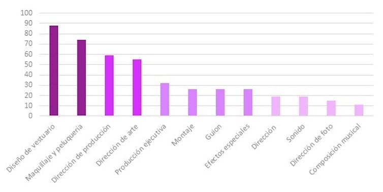 Su informe de 2021 contabiliza un 33 % de mujeres y un 67 % de hombres empleados en este ámbito, siendo este porcentaje inferior en determinadas categorías, como la composición musical (11 %), la dirección de fotografía (15 %), el sonido (19 %) o la dirección (19 %).