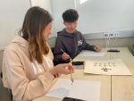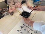 En la parte más práctica del taller, la profesora Yang desveló que existen cinco tipos de escritura: de sello (zhuan shu), clerical (li shu), regular (kai shu), cursiva (xing shu), y de redacción (cao shu). Esta maestra de la caligrafía mostró a los alumnos las herramientas necesarias en esta disciplina. A saber: el pincel, que se divide según el nivel de dureza del pelo. La tinta, de la que existen cinco tonalidades diferentes dependiendo de la cantidad de agua que se añada. Y por último, el papel Xuan, también conocido como papel de arroz, que puede ser crudo, semimaduro y maduro.
