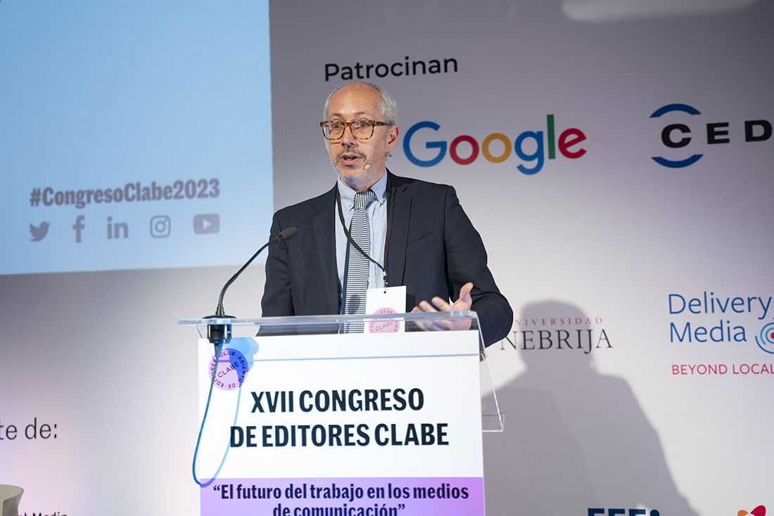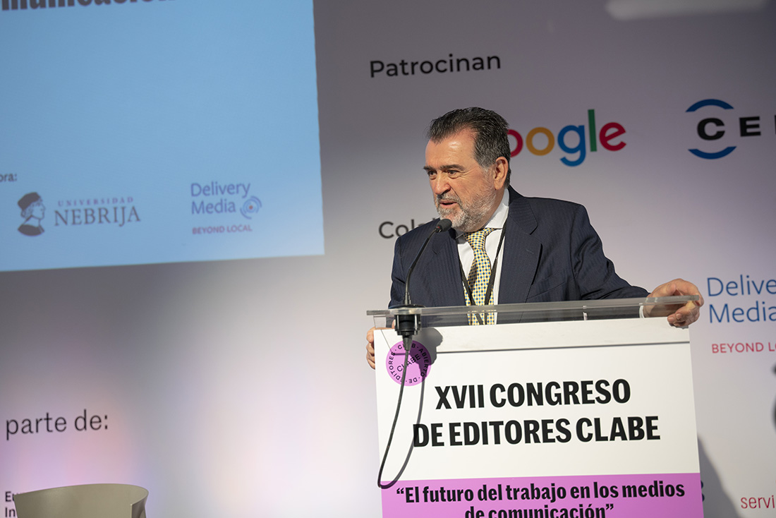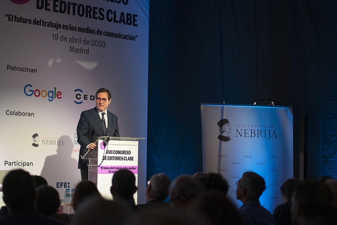En el ecuador de las sesiones de mañana, Antonio Garamendi, presidente de CEOE, elogió la labor de CLABE como una agrupación que acoge “todos los colores y todo tipo de formatos” en la labor de los editores de medios de comunicación como “componentes activos en la democracia”. El dirigente de la patronal recordó a los miembros de CLABE su responsabilidad como empresarios “ante el futuro y el presente de nuestro país y de su diversidad”.
