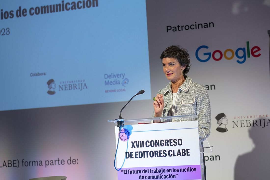 Antes de las sesiones de la tarde, Carme Artigas, secretaria de Estado de Digitalización e Inteligencia Artificial del Ministerio de Asuntos Económicos y Transformación Digital, compartió un almuerzo con los congresistas a los que contó que “la robotización lo que hace es desrrobotizar al ser humano”. “Contra el plagio se lucha con ética, con valores. El periodismo debe reclamar el espacio del pensamiento. Os necesitamos muchísimo. Todos tenemos sesgos, y ahora tenemos una oportunidad de serlo menos. Pero hay que hacerlo muy rápido”, añadió antes de dejar un último mensaje a los editores: “Luchad por la batalla de la reputación y de la veracidad. Necesitamos más que nunca medios creíbles, y eso implica luchar contra la desinformación”. Matilde Pelegrí, vicepresidenta segunda de CLABE y editora de Grupo SENDA, presentó a la secretaria de Estado en este almuerzo de trabajo.