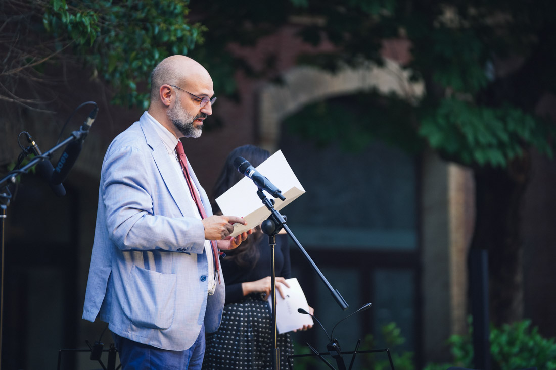 Llega el turno a los egresados de la Universidad. Las palabras, cercanas, fluyen en el patio. Paco Tamayo Alonso-Villaverde estudió Ingeniería Informática y pertenece a la Promoción de 1998. Tras una incursión por Ciencias Físicas, abraza “esa oportunidad de borrón y cuenta nueva” que la Universitas Nebrissensis le ofrece en 1994. “Desde ahí, un nuevo universo, muy buenos amigos con los que algunos (aquí hoy presentes) sigo compartiendo algunas cosas, y una familia, la Nebrija”, contesta en alusión a las preguntas que planteaba Julián Hernández Rodríguez-Cebral, fundador de Siniestro Total: ¿Quiénes somos?, ¿De dónde venimos? ¿A dónde vamos? ¿Estamos solos en la galaxia o acompañados?