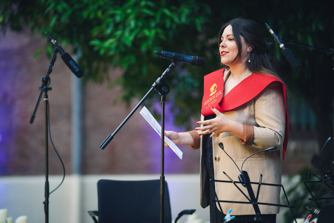 Alicia Martínez Gallardo cursó Periodismo, Artes Escénicas y Comunicación Audiovisual, una protopolímata en toda regla. Dirige su discurso a todos los presentes, en especial a sus compañeros de la Promoción de 2013: “He de confesar que es muy emocionante estar aquí frente a tantas caras conocidas, en un espacio vestido espectacularmente para la ocasión. Y pensaba, que no me iba a emocionar, teniendo en cuenta entre otras cosas, que paseo por este patio casi la mayor parte de horas que tiene mi día. Pero así es la vida, que siempre te sorprende”.