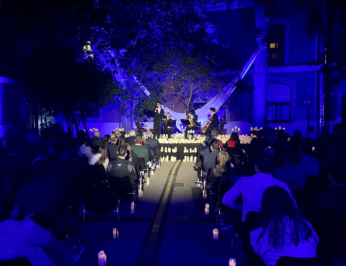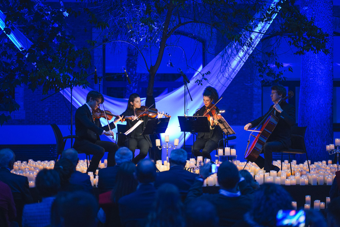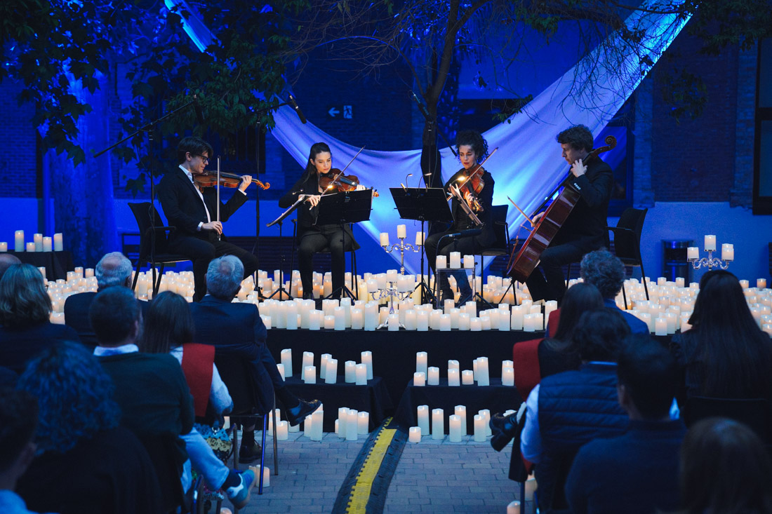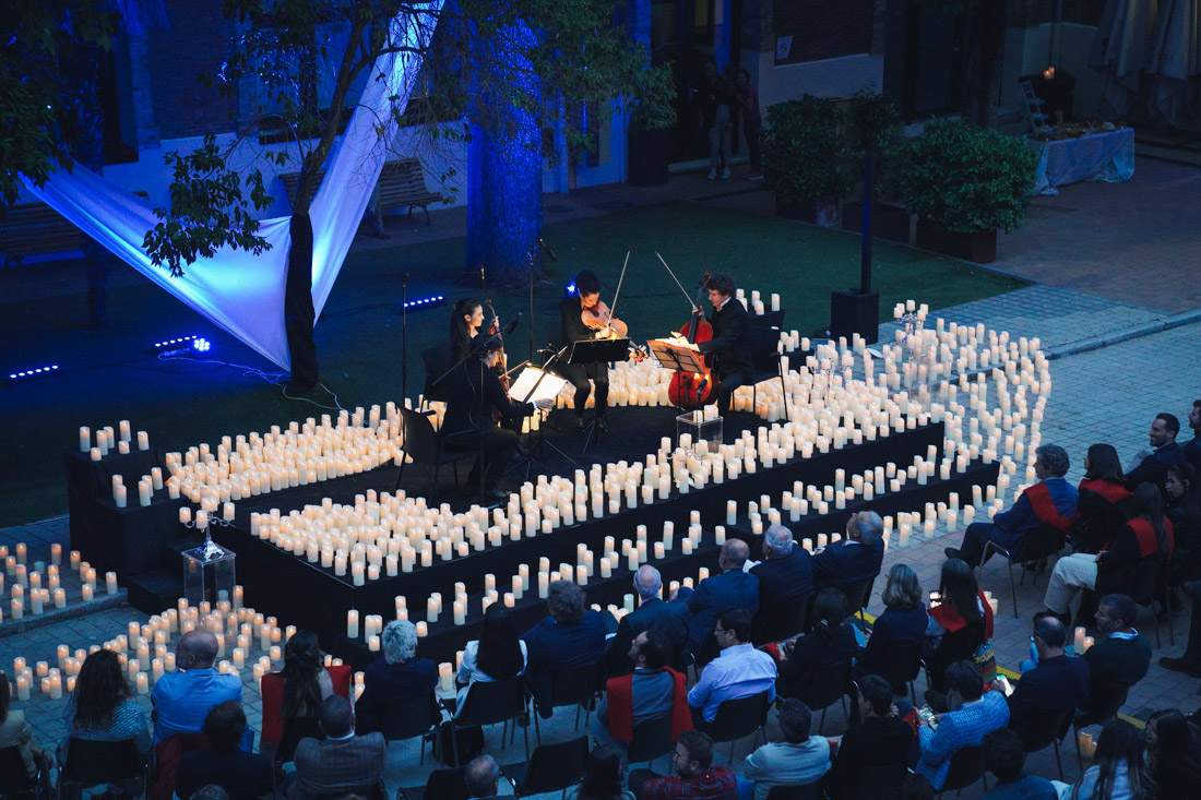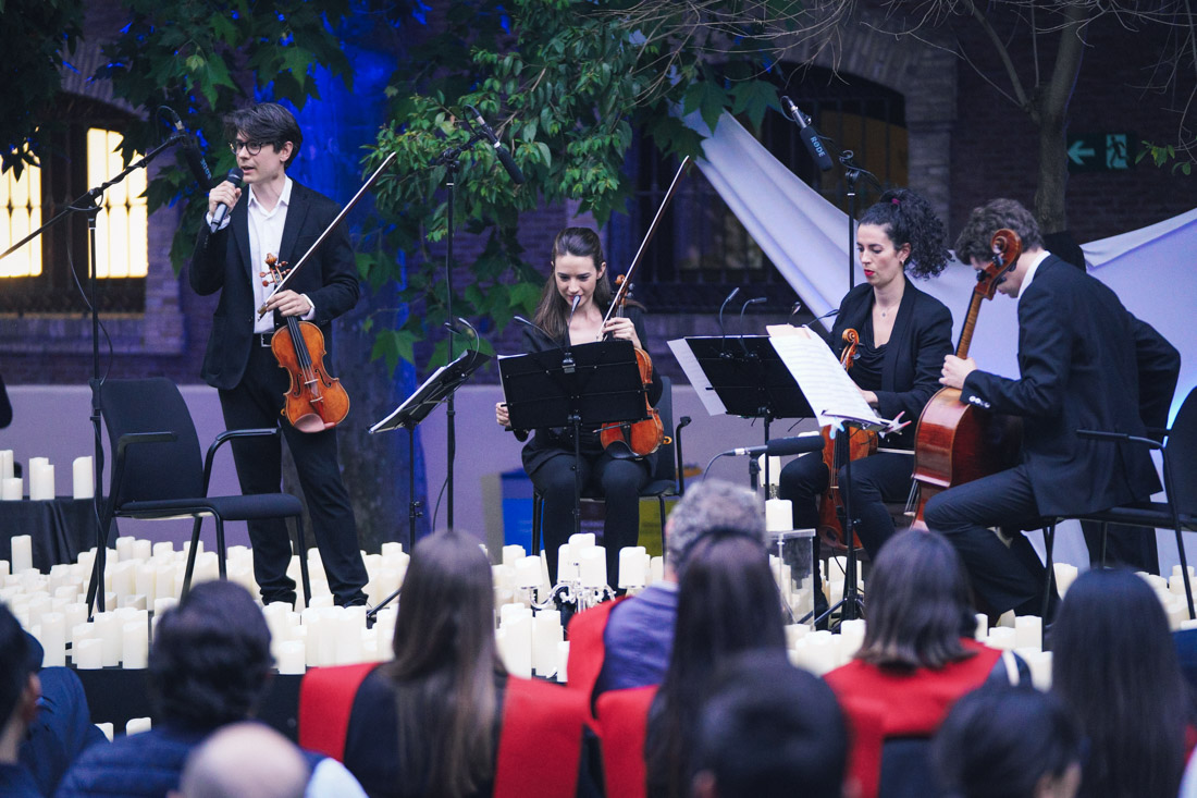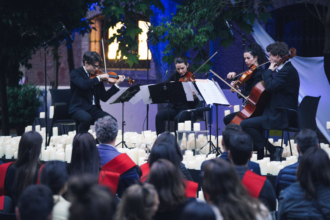 Las palabras se apagan y surge misteriosa la música desde un escenario plagado de velas. Va anocheciendo. Superando inclemencias del viento, el cuarteto de cuerda Matrice viaja por las composiciones de Hans Zimmer en un viaje que incluye el bello Time, de Inception (Origen), una película de ciencia ficción escrita, producida y dirigida por Christopher Nolan. Luego, Mufasa –El Rey León-, Simba y los demás animales de la sabana campan a sus anchas por el patio del campus. Las bandas sonoras van forjando una atmósfera épica e íntima: Madagascar, Dunkirk, The Pacific, The Dark Knight, Wonder Woman, Gladiator, Interstellar, Dune y Sherlock Holmes. El concierto incluye la suite de Los piratas del Caribe, epítome de una experiencia sensorial que actúa de catapulta de los sentimientos de los alumnos que han dejado en Nebrija los mejores años de su vida (y los que les quedan por vivir en una Universidad abierta a sus visitas e iniciativas).
